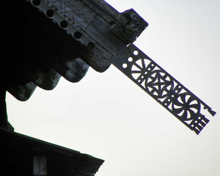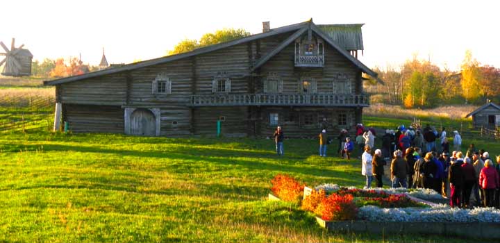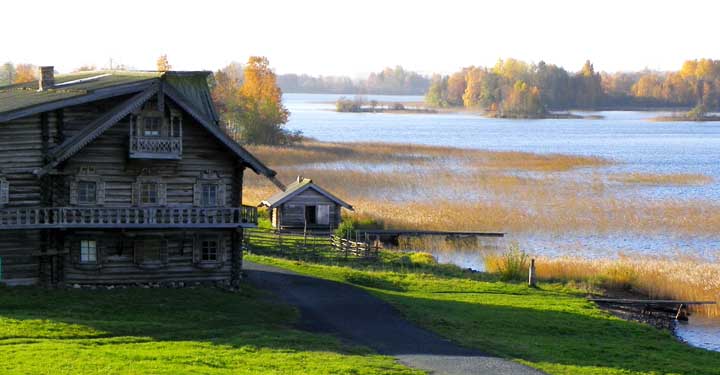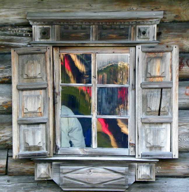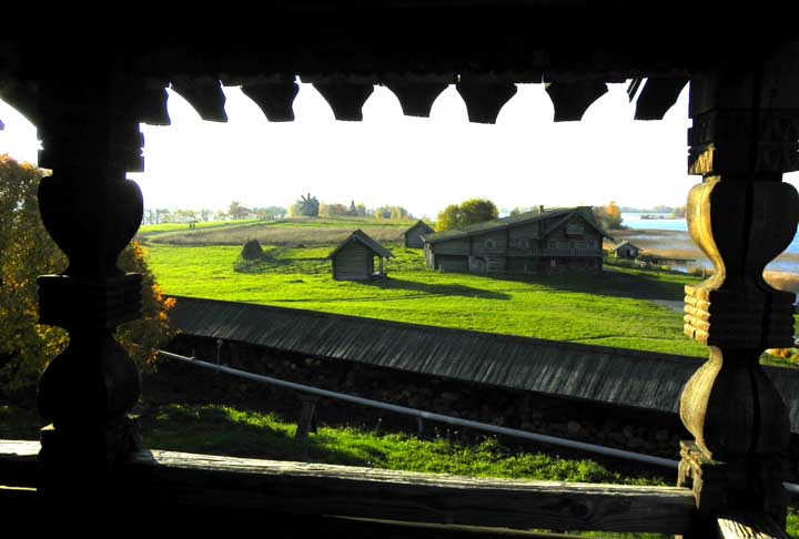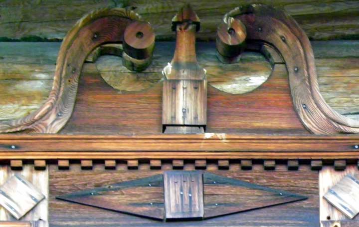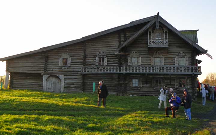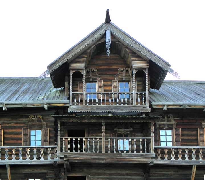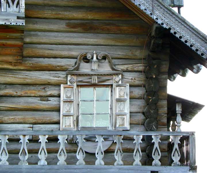North:Lake Onega at Elevation![]() Oshevnev House viewed from the Church of the Intercession ![]() North elevation. Square framework ..... Asymmetrical gable roof (one eave is lower than the other). ![]() The habitable part is two-storied. The lower floor includes a room for wintering, the lower anteroom and storerooms. The attic room in the garret above the anteroom of the upper floor is covered with a gable roof. The habitable part features a gallery running along the upper row of windows on three facades. ![]() Lake Onega, the second largest lake in Europe. ![]() Rubble base. The logs of exterior walls are notched at the corners according to the traditional method with the log ends protruding or extending beyond the corners of each wall. The roof is a nailless construction, made of boards. ![]() Shuttered windows with decorations above and below ![]() Pierced vergeboard ..... Pendent finial ..... Balconet ![]() Pierced vergeboard ..... Swan's neck pediment over decorated frieze in window ![]() Extended pierced vergeboard |