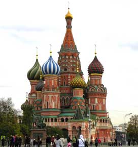 by the Moat (the moat being one that originally ran beside the Kremlin). But the cathedral was popularly known as St. Basil's Cathedral, after St. Basil the Blessed (a.k.a. St. Basil Fool for Christ; 1468-1552), almost from the beginning. Basil impressed Ivan in 1547 when he foretold a fire that swept through Moscow that year. Upon his death, Basil was buried in the Trinity Cathedral that stood on this site at the time. The Cathedral of the Intercession a.k.a. St. Basil's Cathedral was constructed from 1555 to 1560. Legend has it that after it was completed, Ivan had the architect blinded in order to prevent him from building a more magnificent building for anyone else. ... it consists of nine chapels built on a single foundation. The riot of color and shapes that is St. Basil's Cathedral is unmatched anywhere else in the world... Although the towers and domes appear chaotic, there is symmetry and symbolism in its design. There are eight domed chapels symbolizing the eight assaults on Kazan: four large and octagonal and four small and square. In the center is a tent-roofed spire topped with a small golden dome. The ninth chapel on the east side added in 1588 for Basil's tomb interrupts the symmetry of design somewhat. It can be recognized on the outside by its green-and-gold dome studded with with golden pyramids. The interior is a maze of galleries winding from chapel to chapel and level to level via narrow stairways and low arches. The walls are painted in floral and geometric patterns. |