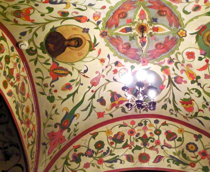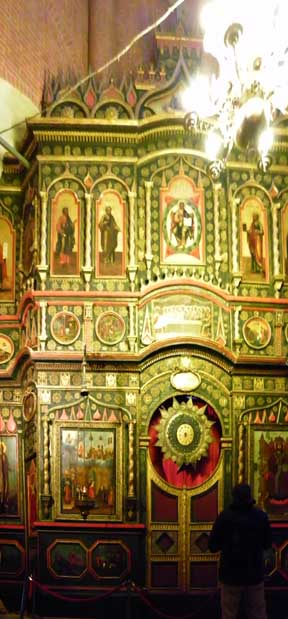 ![]() Baroque style iconostasis in the Central Chapel dates from the 19th century. However, some of the icons were painted much earlier. Upper left paired icons illustrated next: ![]() Note plaster Baroque twisted columns |