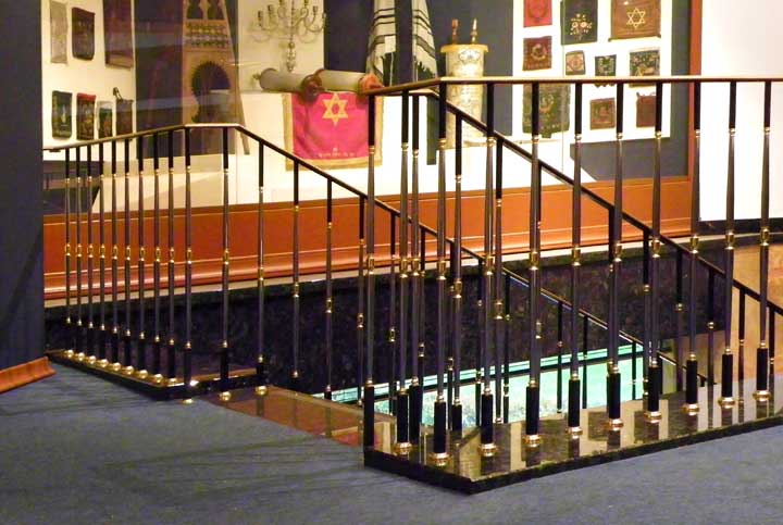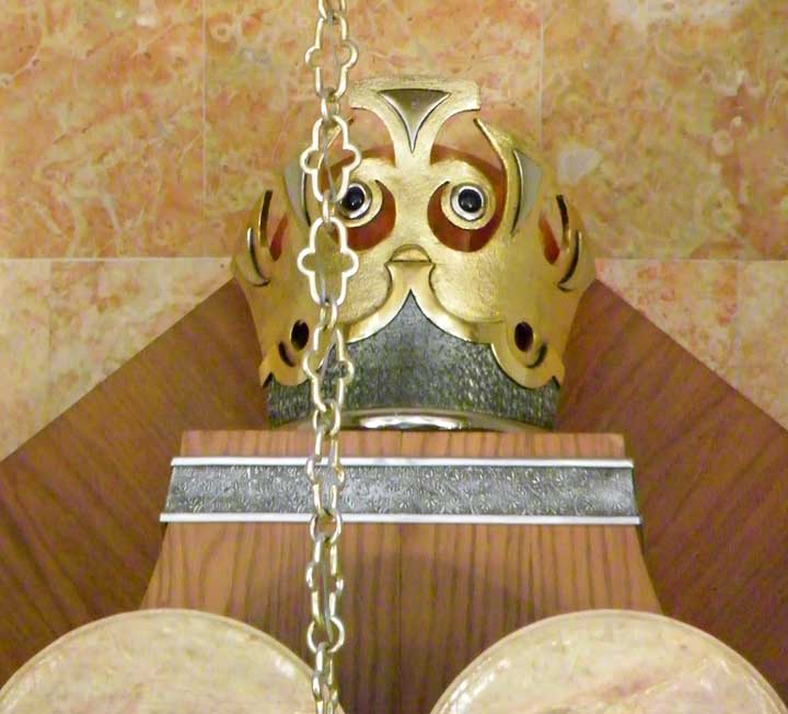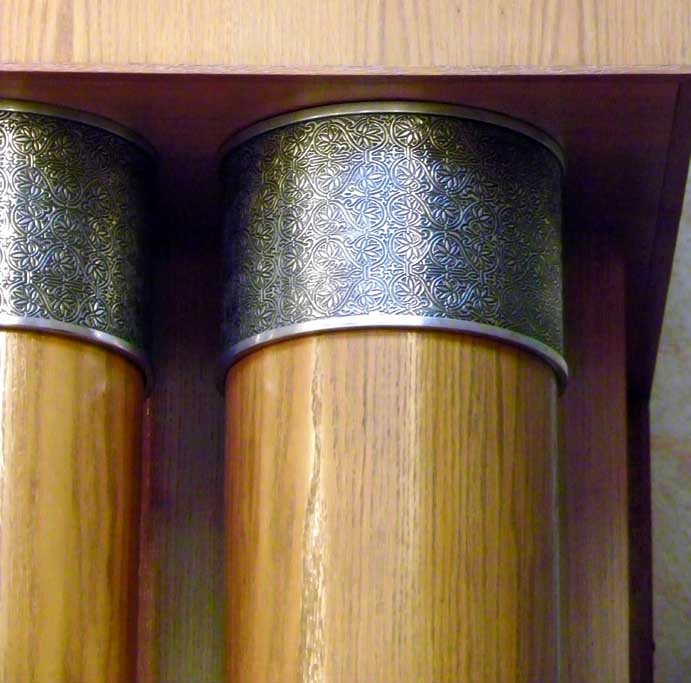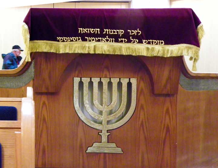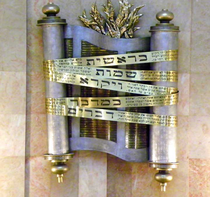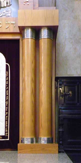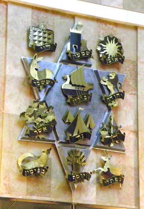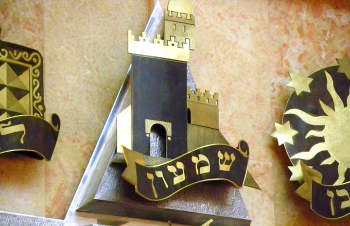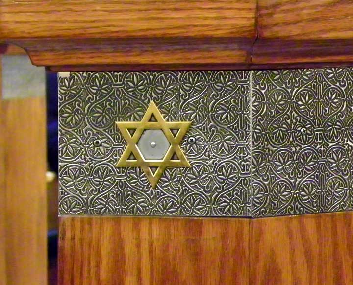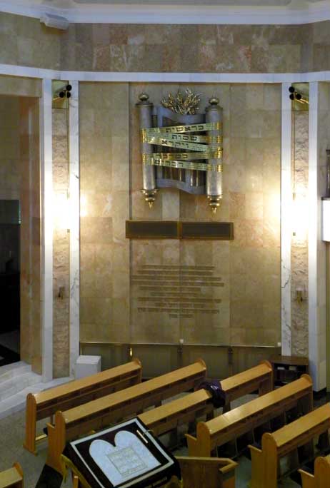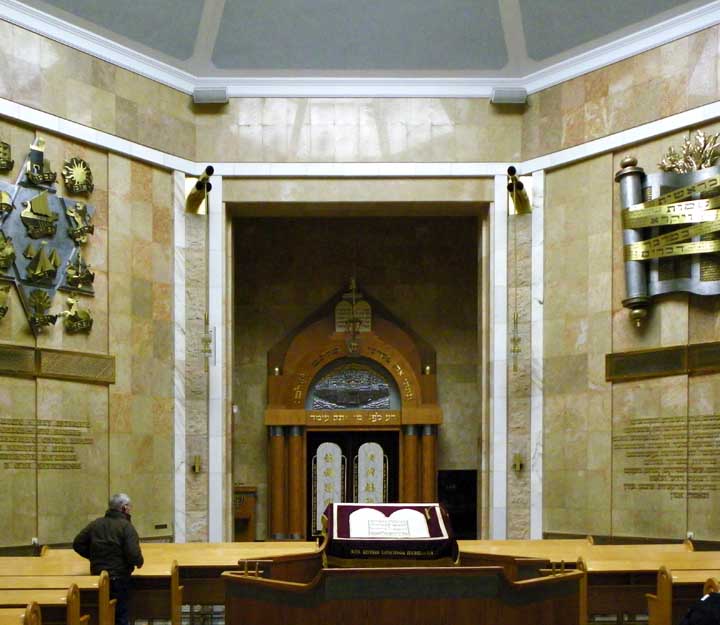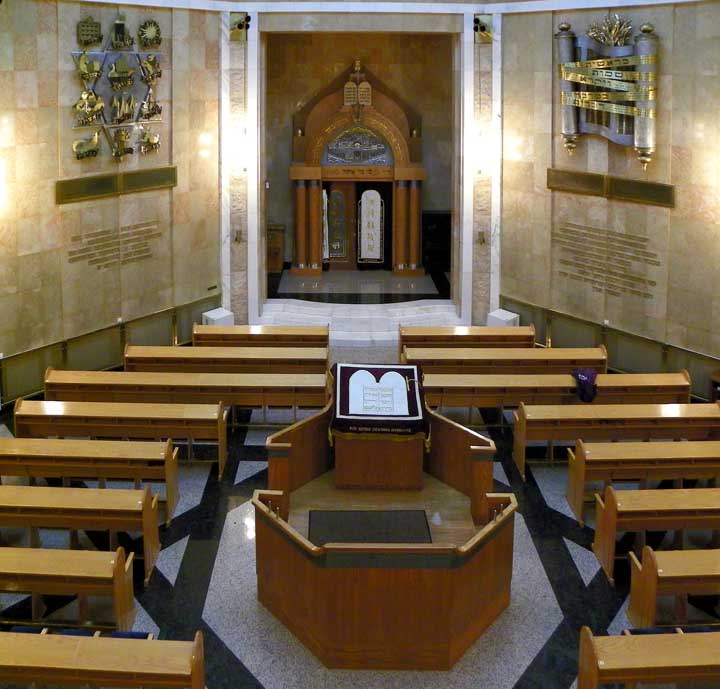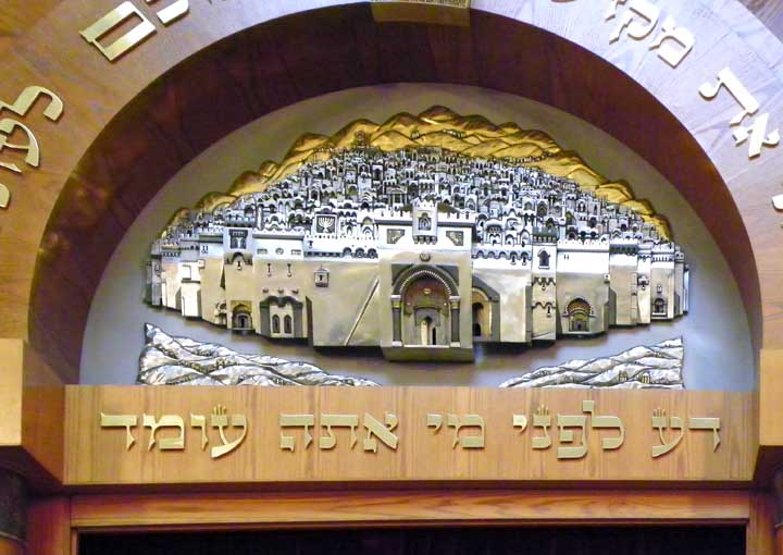 Frank Meisler designed the interior, including wall sculptures showing Jerusalem (6 ft., 9 in.), the Twelve Tribes of Israel (10 ft.) and the Five Books of Moses (10 ft.).