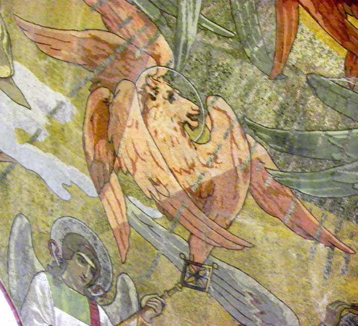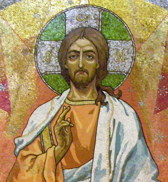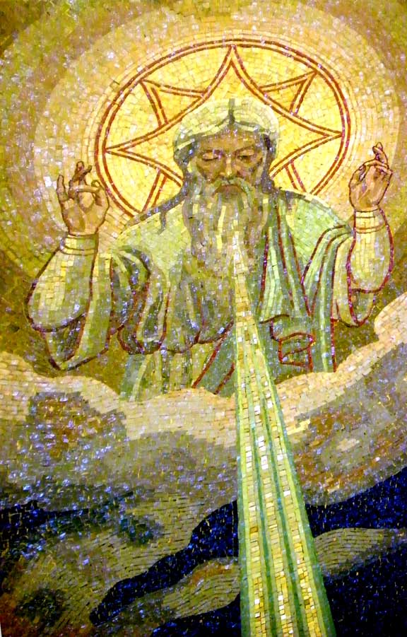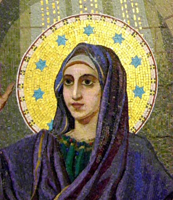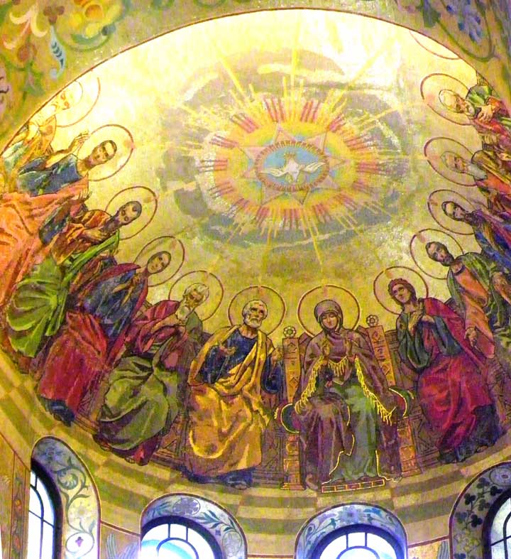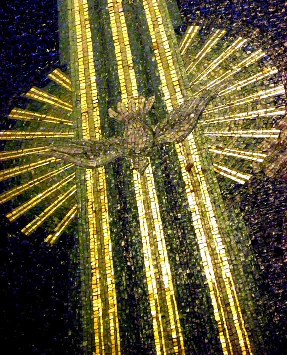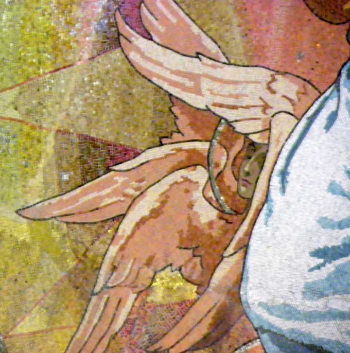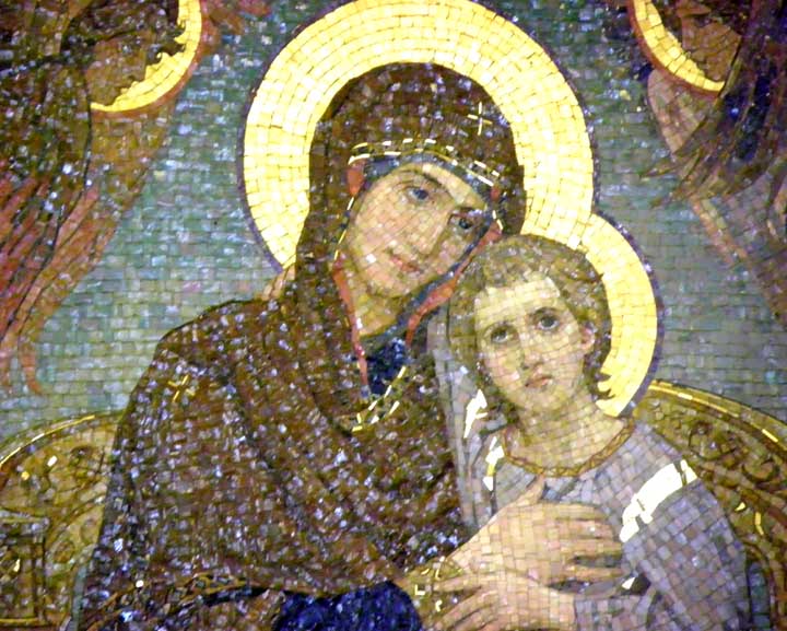 Pillar mosaic: God the Father, Holy Spirit in the form of a dove, and the Virgin Mary an Annunciation scene without the Archangel Gabriel ![]() God the Father and the Holy Spirit in the form of a dove are not visible in this photo because of a lighting problem, but see photos below. ![]() God the Father wih blessing hand gestures ![]() Holy Spirit in the form of a dove ![]() The Virgin Mary |