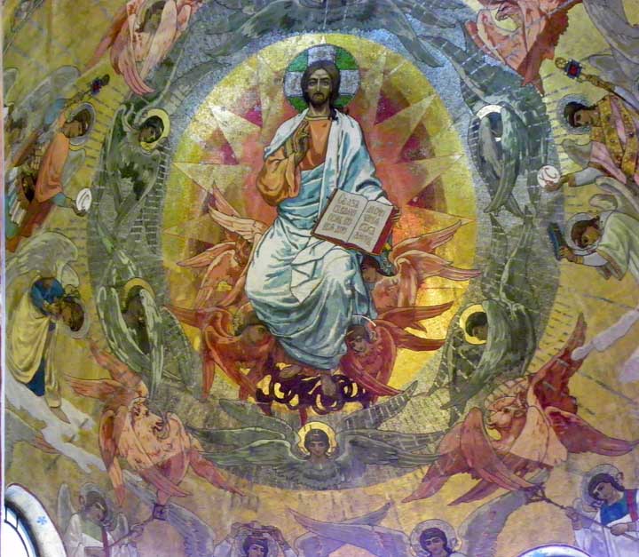 ![]() Central nave includes Christ Pantocrator designed by Nikolai Kharlamov. ![]() Christ Pantocrator ![]() Christ is surrounded by a mandorla ![]() Right hand raised in a blessing gesture ![]() Six-winged seraph angel ![]() Center: Cherub angel ![]() ![]() Icon of the Mother of God ![]() |