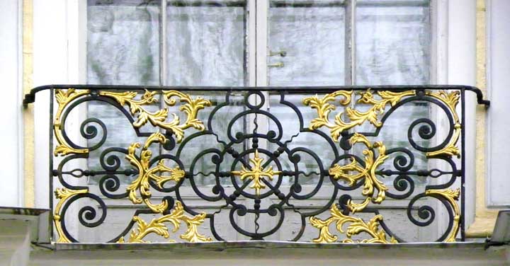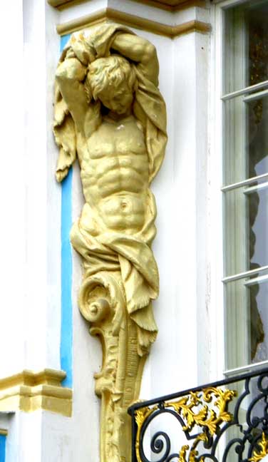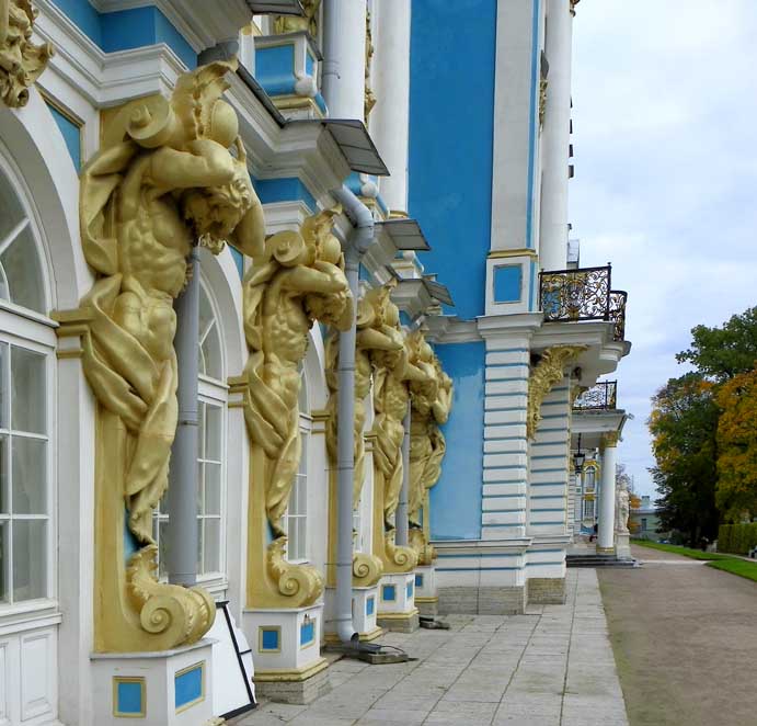 decorated blue-and-white facades featuring gilded atlantes, caryatids