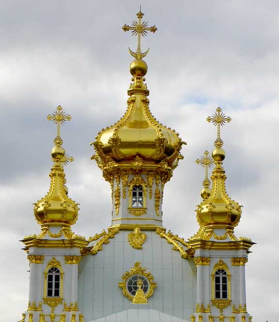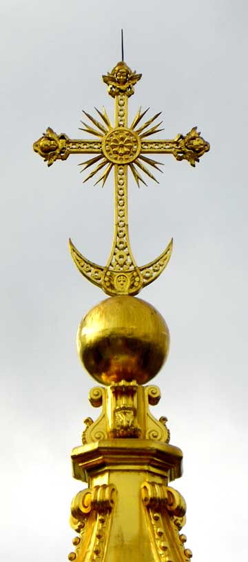 East Chapel ![]() Rococo style features gilded Russian onion domes ![]() Cross bottony atop crescent moon. S scroll buttresses. ![]() Onion domes |