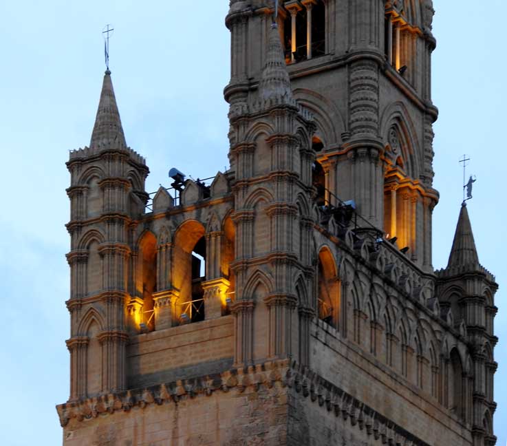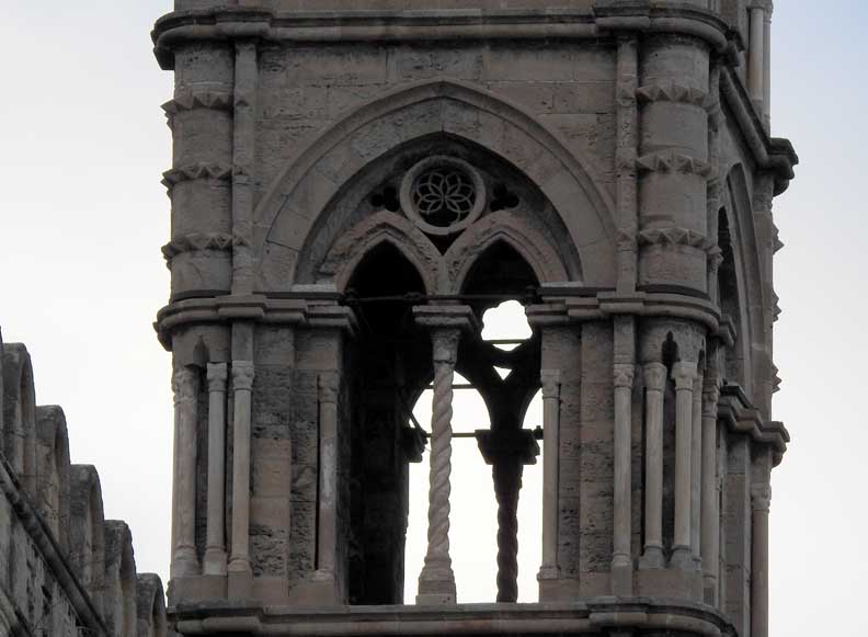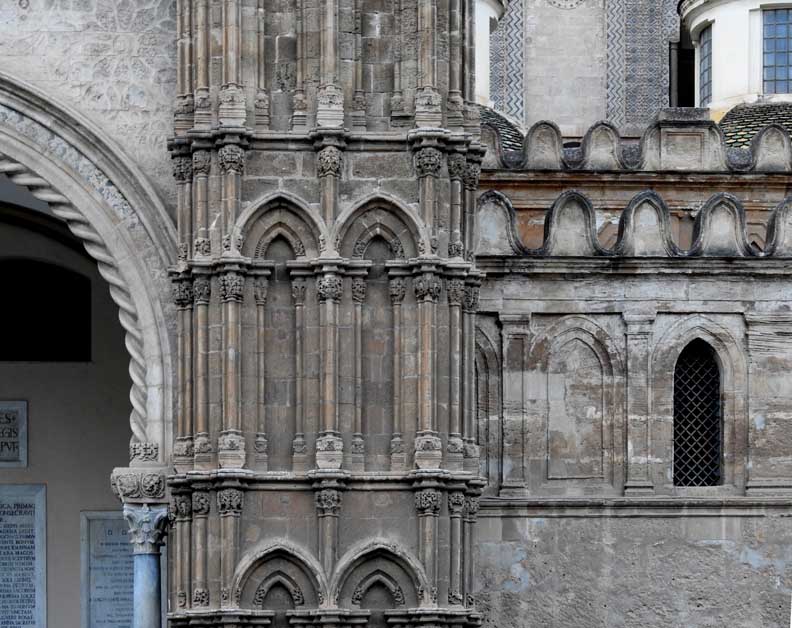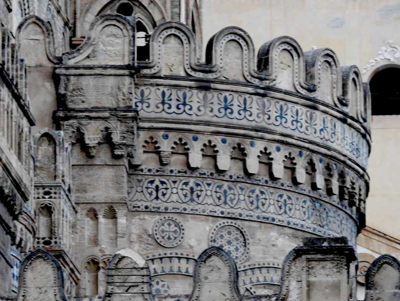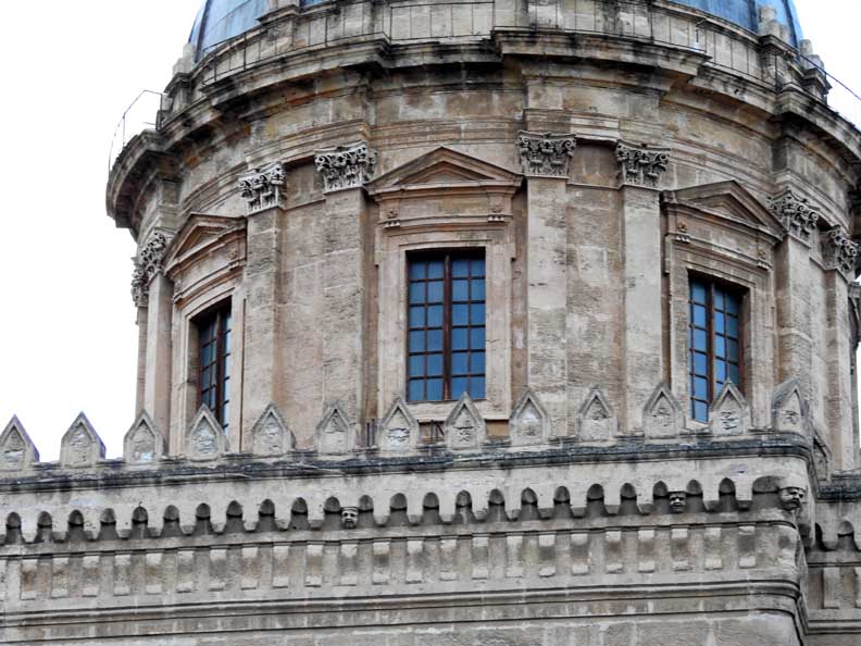 ![]() Main entrance - Portico at left ... Top: Norman Romanesque battlement ... Later added Baroque windows with engaged cupolas ![]() Baroque window with finial atop engaged cupola ![]() The 1785 Baroque cupola changes the Norman Romanesque geometric character of the building ... Because the Catholic Church came to regard the Baroque as the epitome of artistic expression and the glorification of God, the Baroque style flourished. Thanks to the patronage of the Church, promoted by generations of popes, cardinals, priests, missionaries and worshipers, the style spread around the world. ... Note two corner towers that mirror the two at the opposite end of the building ![]() "... large cupola constructed in 1785, severely altered its appearance. This dome, and the extensive Baroque reconstruction of the interior, completely defaced the beautiful Norman Arab arches and lines of the inside of the church and corrupted the exterior's aesthetic lines." - Best of Sicily (online July 2020) ... Finial atop lantern atop cupola atop drum ... Two details below: ![]() Finial atop lantern atop cupola ![]() Cupola drum ... Drum features Corinthian(?) pilasters and Baroque window surrounds ... Norman Romanesque battlement ![]() Blind arcade ... Blending of Norman Romanesque moldings on Gothic pointed arches ... Chevron moldings ![]() Battlement ... Blind arcade ... Belfry above clock ... Two Norman Arab style towers with some Gothic features ![]() Belfry ... Conical roof with finial ... 4 pinnacles ![]() Two twisted columns with pointed Gothic arches ![]() Blind arcades ![]() ![]() Battlement ... Decorated friezes ... Corbel table |