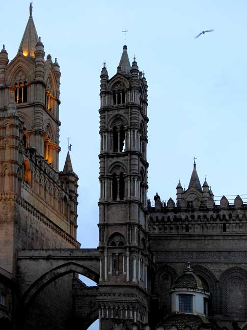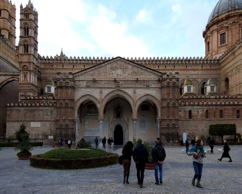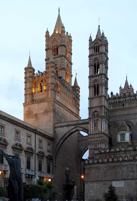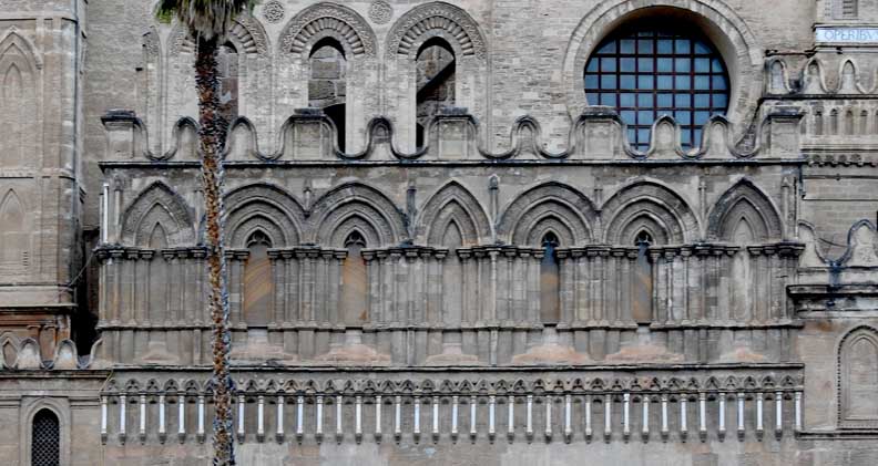 basilica. The archbishop's main aim was to surpass the glory of the magnificent cathedral of nearby Monreale, and the Palermo Duomo became an architectural battleground for "The Battle of the Two Cathedrals." For most visitors, Monreale Duomo remains the winner, but Palermo's cathedral is still well worth a visit.15th century Spanish architecture Many additions were made to the original Norman structure over the years. The exterior was "Gothicized" in the 13th and 14th centuries, and the Spaniards made their mark in the 15th century. But if anyone could be called the culprit for the cathedral's playground of styles, it is the Neapolitan architect Ferdinando Fuga, who went with the mood of his day and in 1771 and 1809 gave both the exterior and the interior of the Duomo a sweeping Neoclassical style. The only section that the restorers didn't touch were the apses, which still retain their impressive Geometric [ Norman ] decoration. - Sacred Destinations: Palermo Cathedral (online May 2020) |