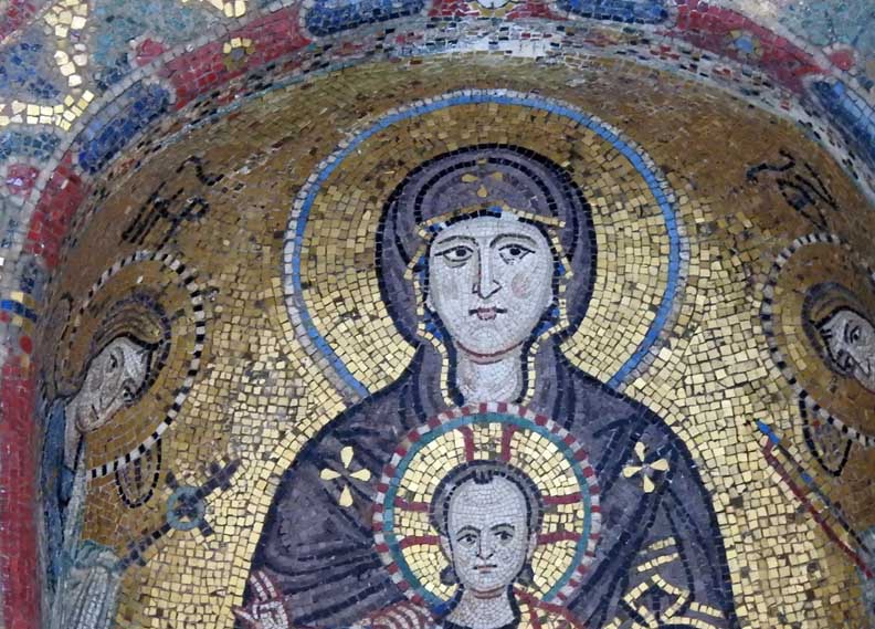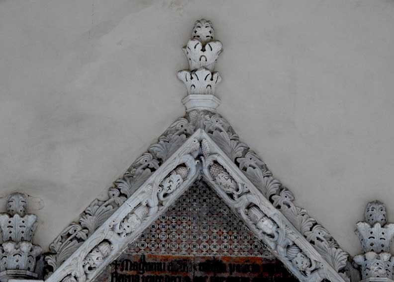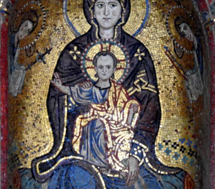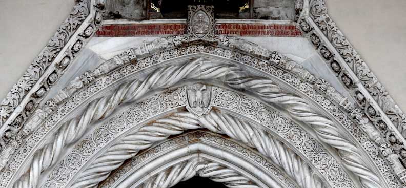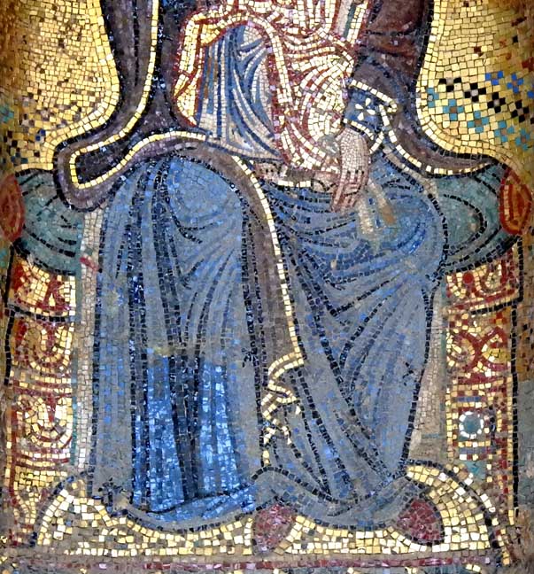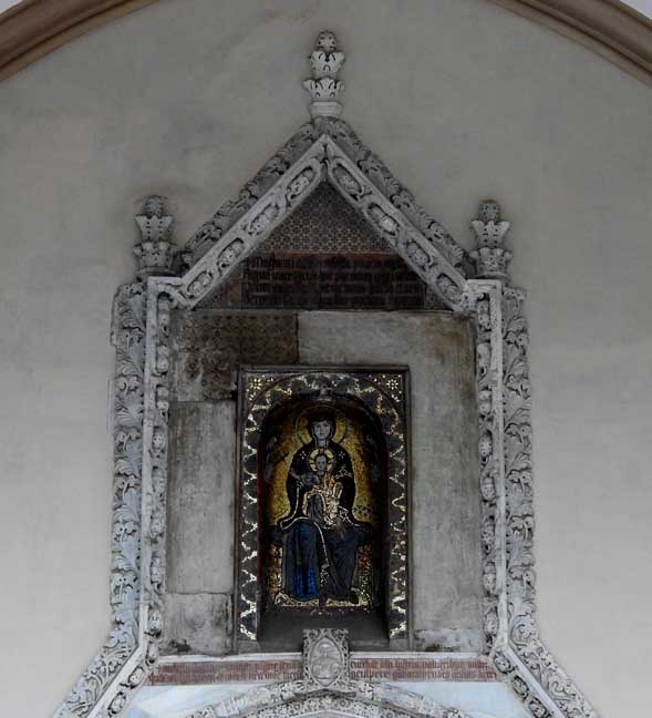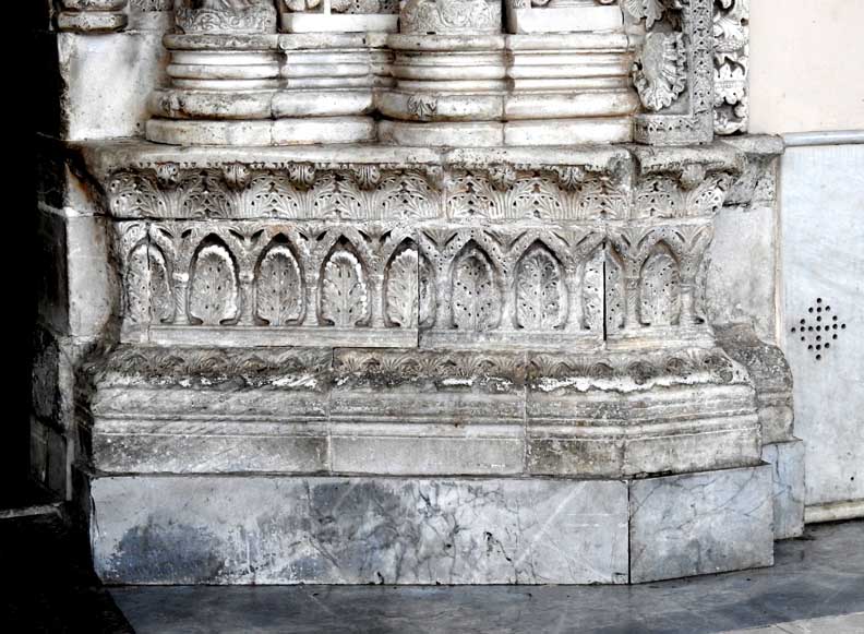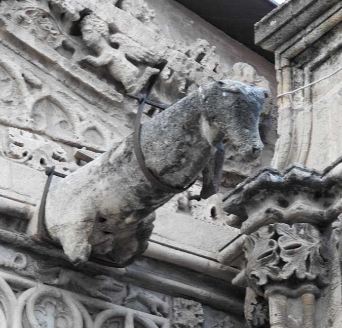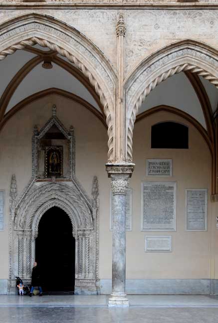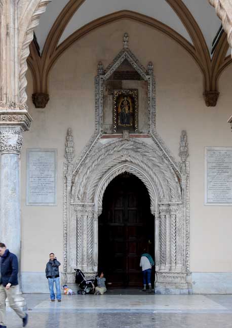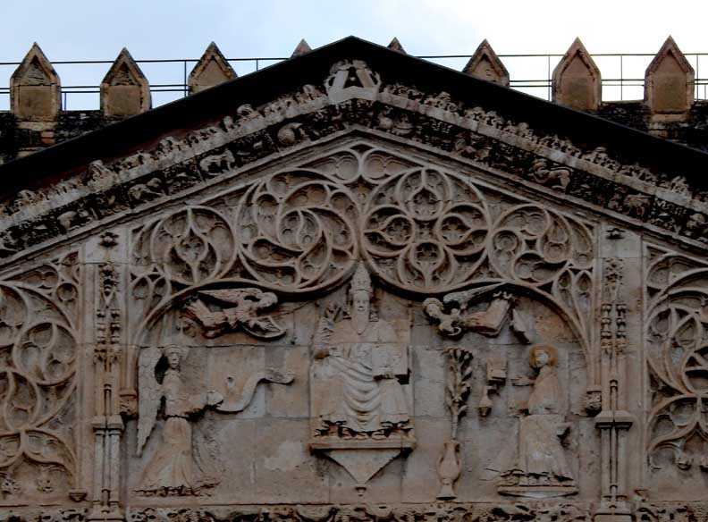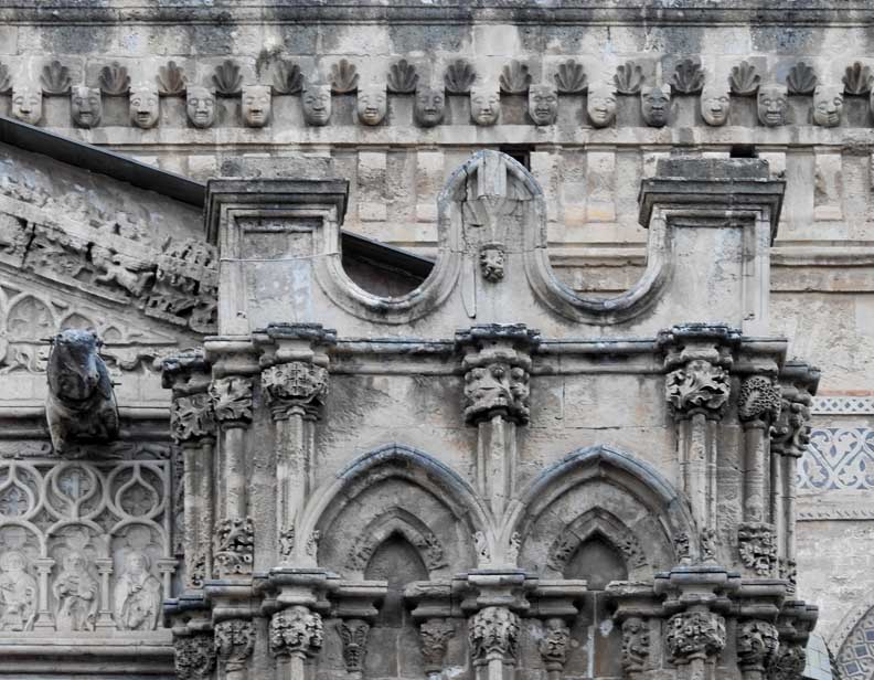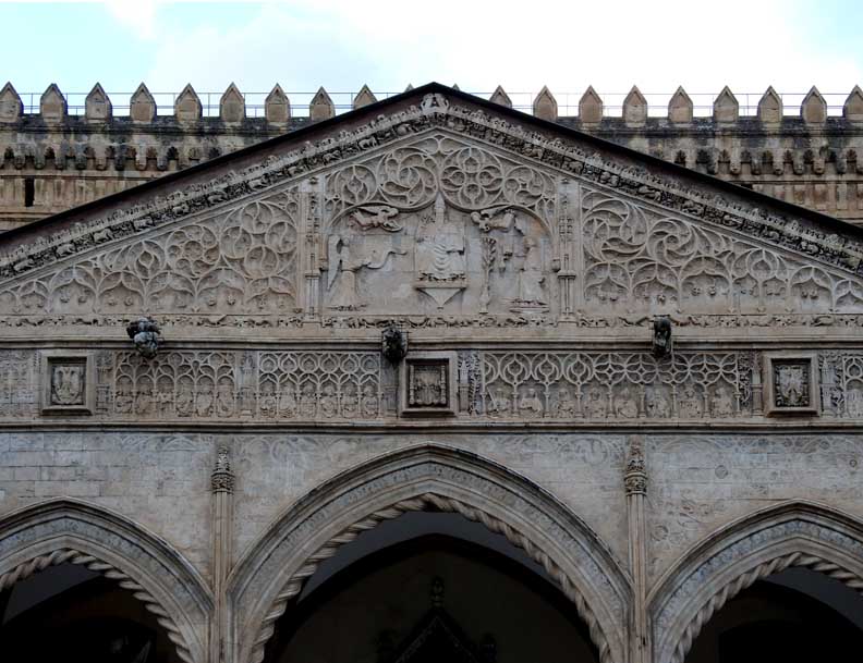Main entrance - Portico Subtle Catalonian Gothic touches such as the portico, with its gargoyles - in the form of angels rather than grotesques - complement the original styles. Designed by Antonino Gambara, it was added in 1453. ![]() Main entrance - Portico South elevation current main entrance portico ... C. 1465 portico flanked by towers ... Romanesque pediment over Gothic arches ![]() Main entrance - Portico Gargoyles between upper Norman Romanesque style tympanum and lower Norman Romanesque style frieze ![]() Main entrance - Portico Norman Romanesque style battlement ... Norman Romanesque style bas-relief tympanum ![]() Main entrance - Portico Gothic gargoyle ![]() Main entrance - Portico Gothic gargoyle ![]() Main entrance - Portico Gothic gargoyle ![]() Main entrance - Portico Right tower ... Note Gothic gargoyles ... Two details below: ![]() Main entrance - Portico At left: Gothic gargoyle ... Tower ![]() Main entrance - Portico Tower ![]() Main entrance - Portico Blending of Norman Romanesque rope molding on Gothic pointed arches ![]() Main entrance - Portico Blending of Norman Romanesque rope molding on Gothic pointed arches ![]() Main entrance - Portico Three foliated finials ![]() Main entrance - Portico The Byzantine mosaic portraying the Mother of God is from the 13th(?) century ... Three details below: ![]() Main entrance - Portico Mother of God detail ![]() Main entrance - Portico Mother of God detail ![]() Main entrance - Portico Mother of God detail ![]() Main entrance - Portico Blending of Norman Romanesque moldings on Gothic pointed arches ![]() Main entrance - Portico Blending of Norman Romanesque moldings on Gothic pointed arches ... Three more details below: ![]() Main entrance - Portico Norman Romanesque detail ![]() Main entrance - Portico Norman Romanesque detail ... Rope molding ... Chevron molding ![]() Main entrance - Portico Norman Romanesque detail |