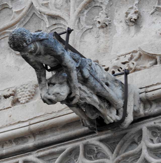 towers![]() Western towers Left: Archbishop's Palace (now a museum) and bell tower/campanile ... Middle: Two arcades over the street connect the western facade of the cathedral, at the right, to the bell tower , at the left ... Right: One of two towers at the corners of the cathedral's western facade and original main entrance ... Two details below: ![]() Western towers Detail #1 - Bell tower/campanile at left ... Two arcades ... Cathedral corner tower built between the 14th and the 15th centuries ![]() Western towers Detail #2 - Bell tower/campanile ... Belfries and arcades ... Turrets with conical roof |