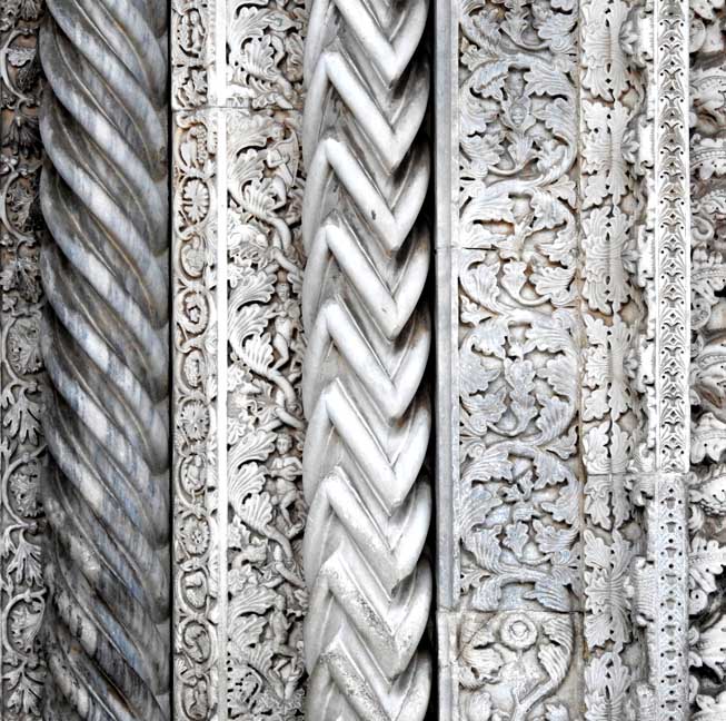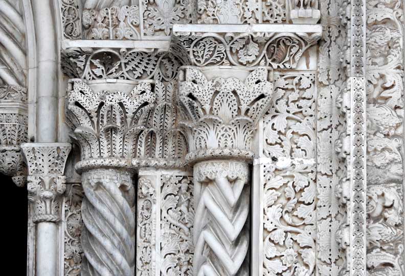 ![]() South elevation The Baroque cupola changes the Norman Romanesque geometric character of the building ... Cathedral details below, starting at the left: |