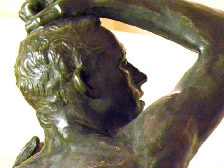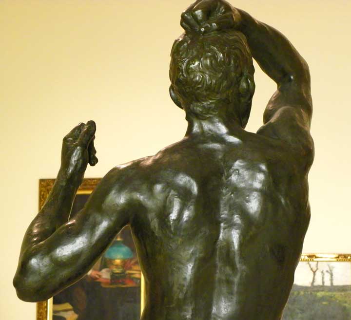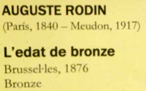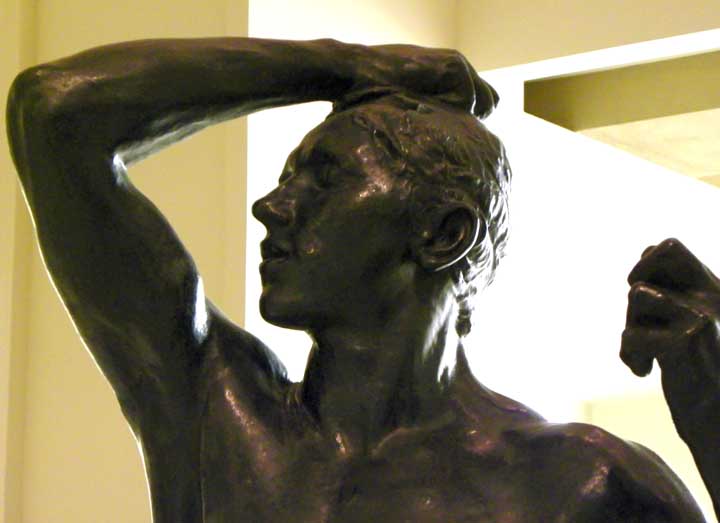 arm held out at his side, forearm parallel to the body. In 1877, the work debuted in Brussels and then was shown at the Paris Salon. The statue's apparent lack of a theme was troubling to critics—commemorating neither mythology nor a noble historical event—and it is not clear whether Rodin intended a theme.[20] He first titled the work The Vanquished, in which form the left hand held a spear, but he removed the spear because it obstructed the torso from certain angles. After two more intermediary titles, Rodin settled on The Age of Bronze, suggesting the Bronze Age, and in Rodin's words, "man arising from nature".[21] Later, however, Rodin said that he had had in mind "just a simple piece of sculpture without reference to subject".[21] Its mastery of form, light, and shadow made the work look so realistic that Rodin was accused of surmoulage—having taken a cast from a living model. Rodin vigorously denied the charges, writing to newspapers and having photographs taken of the model to prove how the sculpture differed. He demanded an inquiry and was eventually exonerated by a committee of sculptors. Leaving aside the false charges, the piece polarized critics. It had barely won acceptance for display at the Paris Salon, and criticism likened it to "a statue of a sleepwalker" and called it "an astonishingly accurate copy of a low type".[21] Others rallied to defend the piece and Rodin's integrity. The government minister Turquet admired the piece, and The Age of Bronze was purchased by the state for 2,200 francs—what it had cost Rodin to have it cast in bronze.[21] - Wikipedia