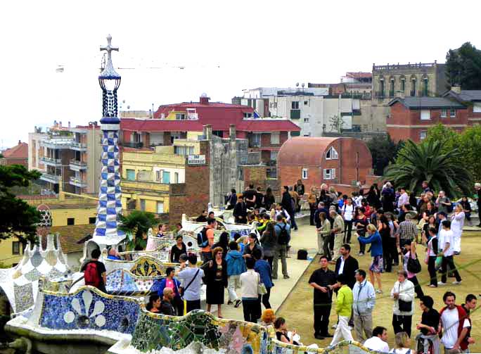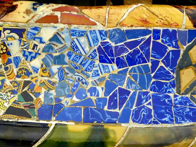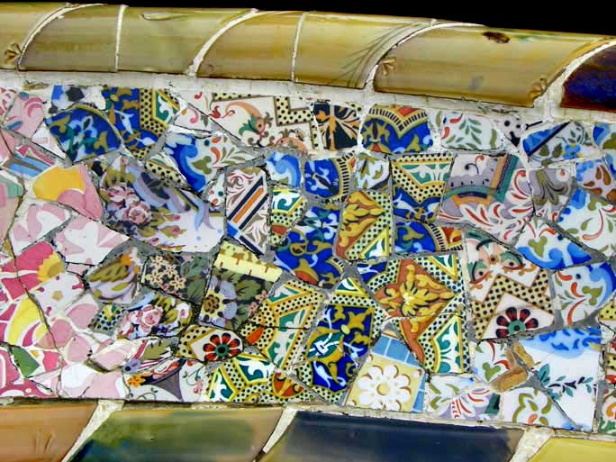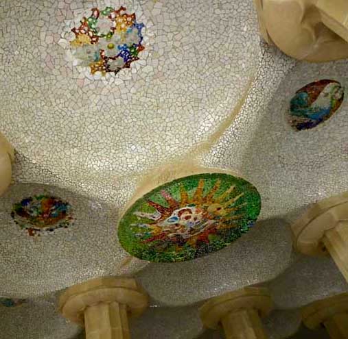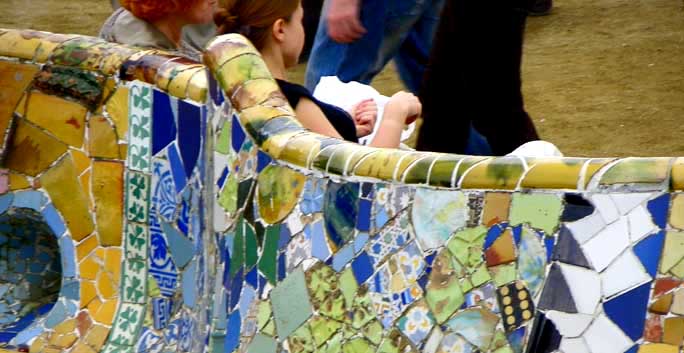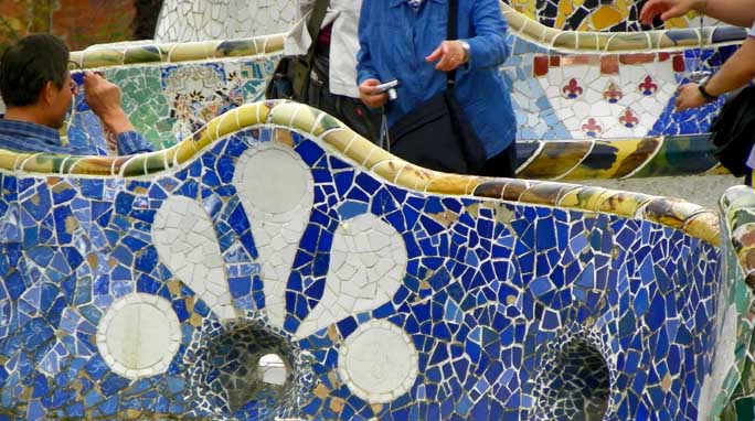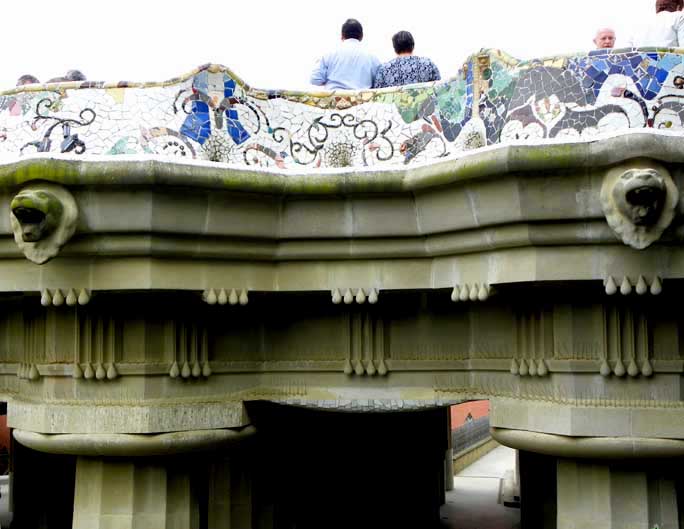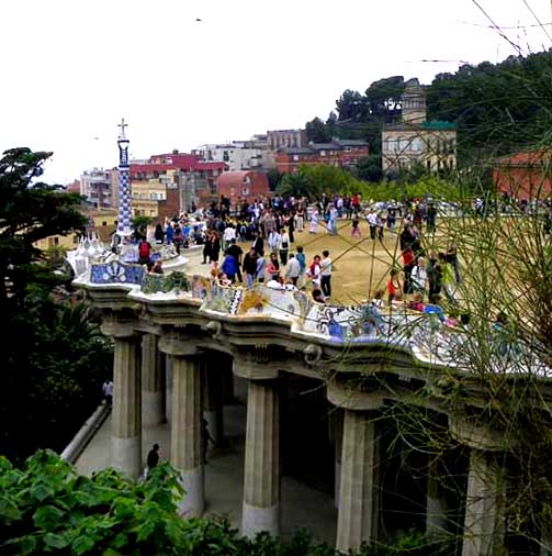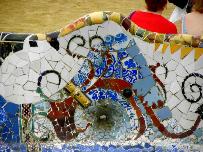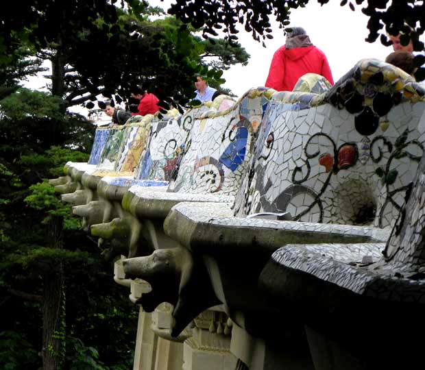 The focal point of the park is the main terrace, surrounded by a long bench in the form of a sea serpent. The colorful ceramic serpentine bench, designed by Jujol, twists snakelike around the plaza. The view from the plaza is spectacular, you can see as far as the Mediterranean Sea. To design the curvature of the bench surface Gaudí used the shape of buttocks left by a naked workman sitting in wet clay.