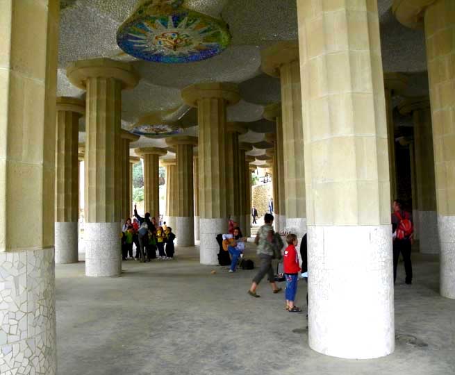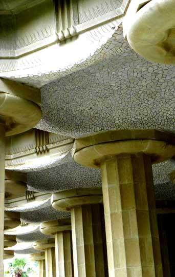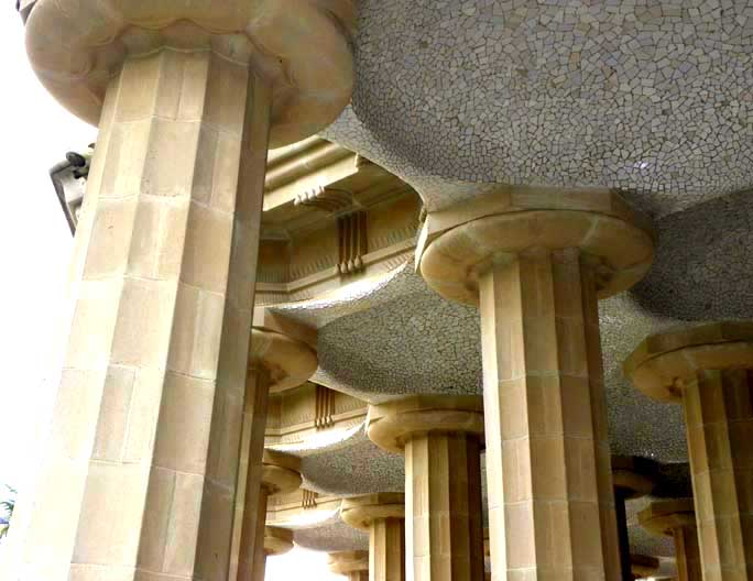 The whole terrace/serpentine bench platform is supported by 86 huge, slightly angled, Doric columns (to simulate trees), creating a hypostyle hall beneath the plaza,