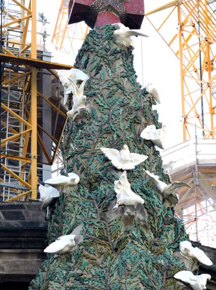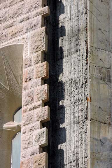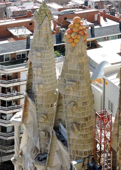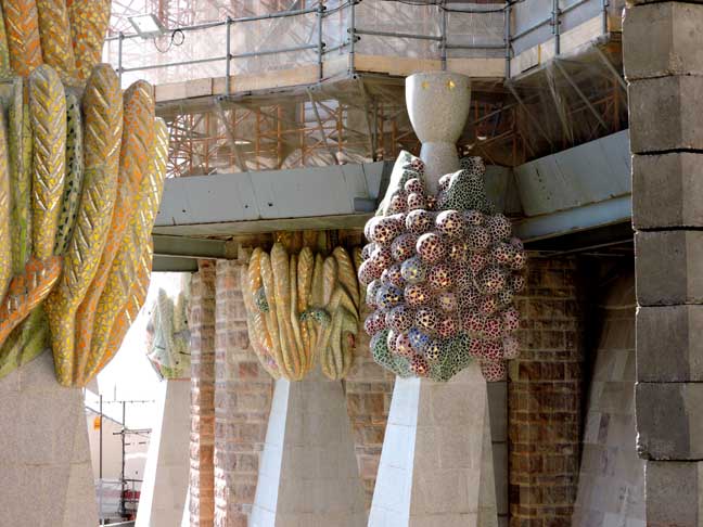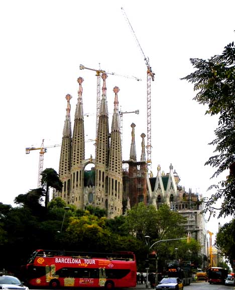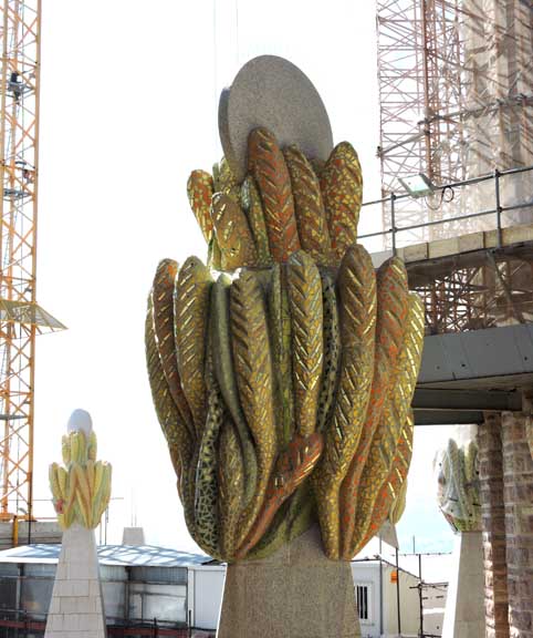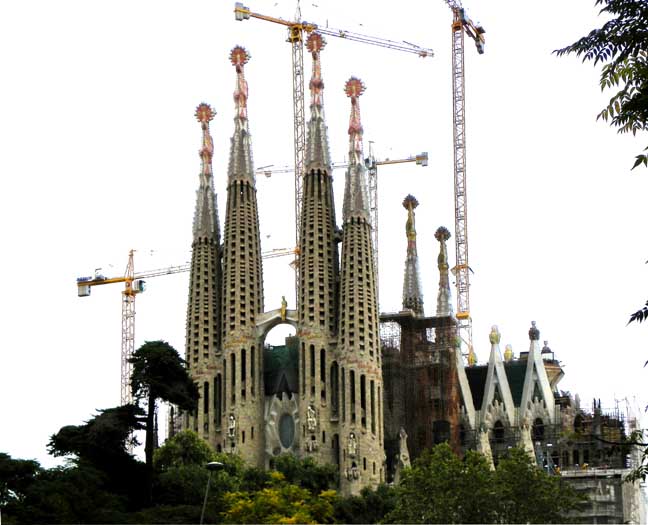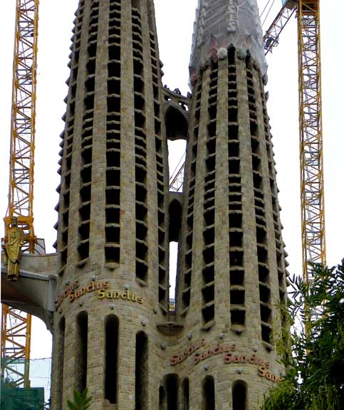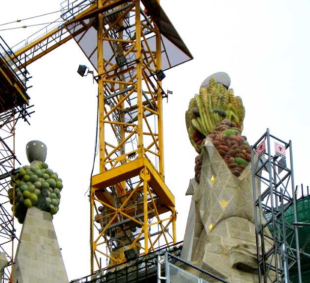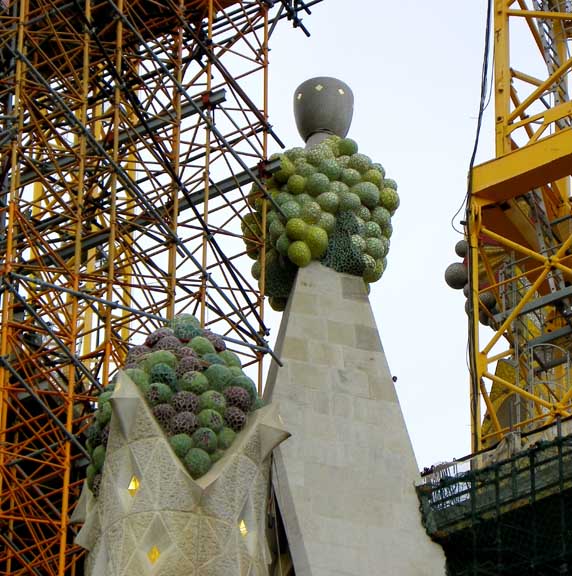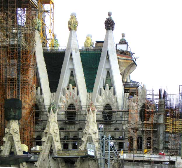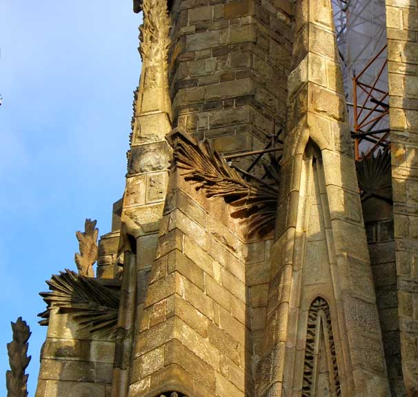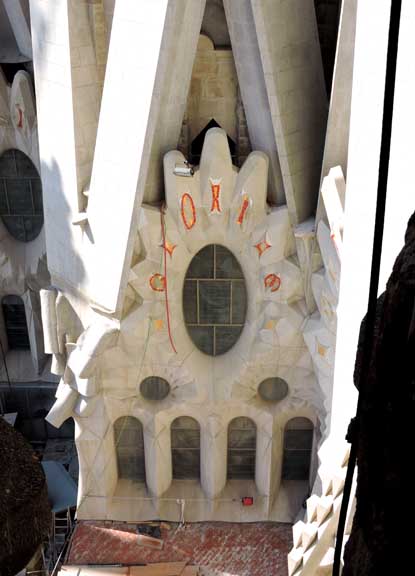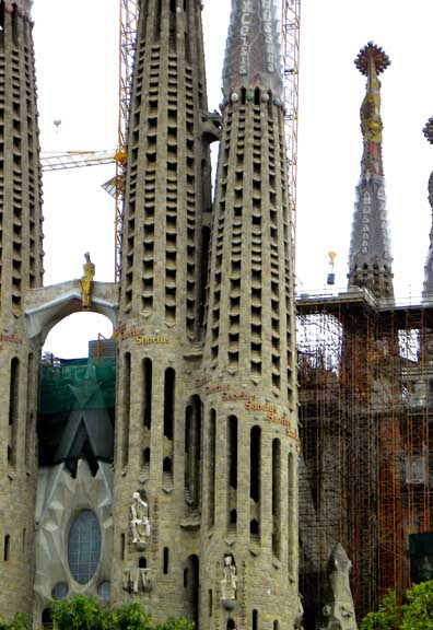 The largest and most striking of the facades will be the Glory Façade, which began construction in 2002. It will be the principal façade and will offer access to the central nave. Dedicated to the Celestial Glory of Jesus, it represents the road to God: Death, Final Judgment, and Glory, while Hell is left for those who deviate from God’s will. Aware that he would not live long enough to see this façade completed, Gaudí made only a general sketch of what the façade would look like. He intended for the temple, like many cathedrals and facades throughout history, to be completed not only by other architects, but also to incorporate others architectural and artistic styles. To reach the Glory Portico, there will be a large staircase, which will create an underground passage beneath Mallorca Street, representing Hell and vice. It will be decorated with demons, idols, false gods, heresy and schisms, etc. Purgatory and death will also be depicted, the latter using tombs along the ground. The portico will have seven large columns dedicated to spiritual gifts. At the base of the columns there will be representations of the Seven Deadly Sins, and at the top, The Seven Virtues. - Wikipedia (8/2010)