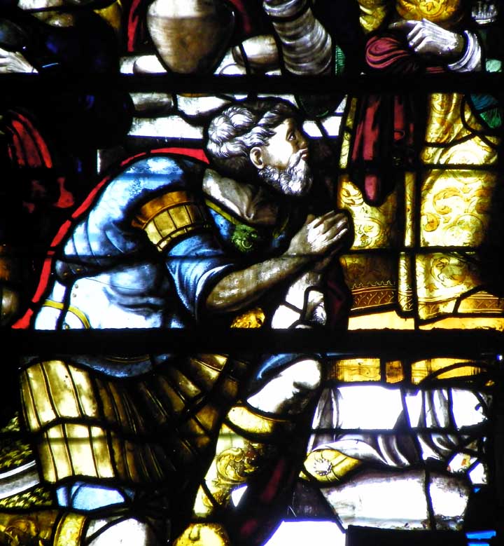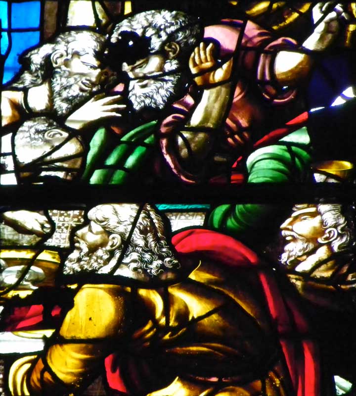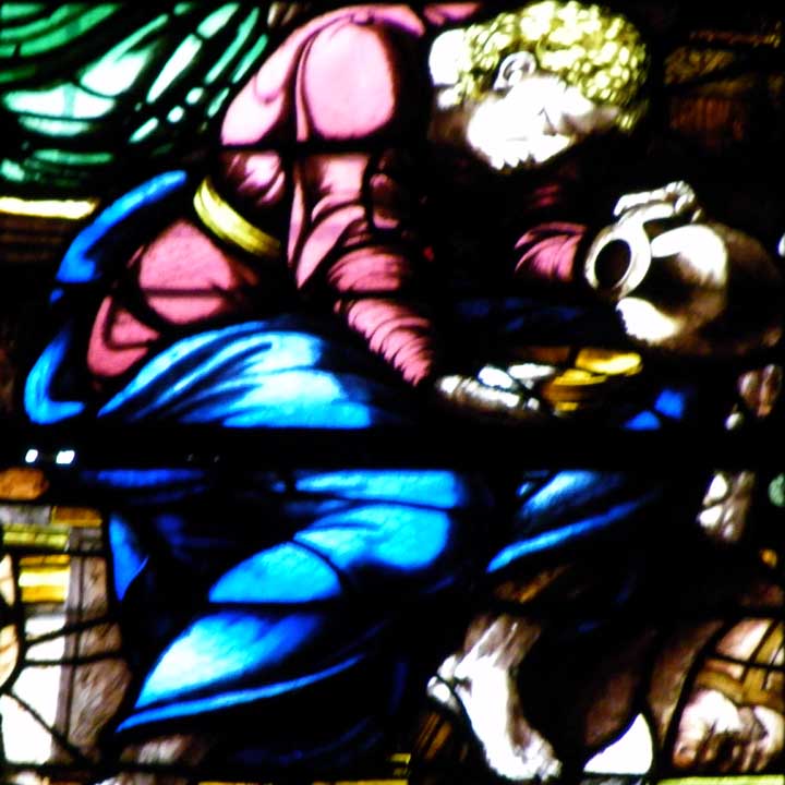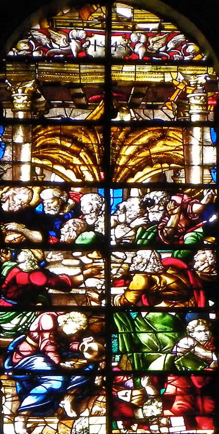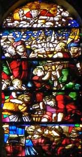 The stained glass below is arbitrarily titled The Last Supper because of the center panel scene.