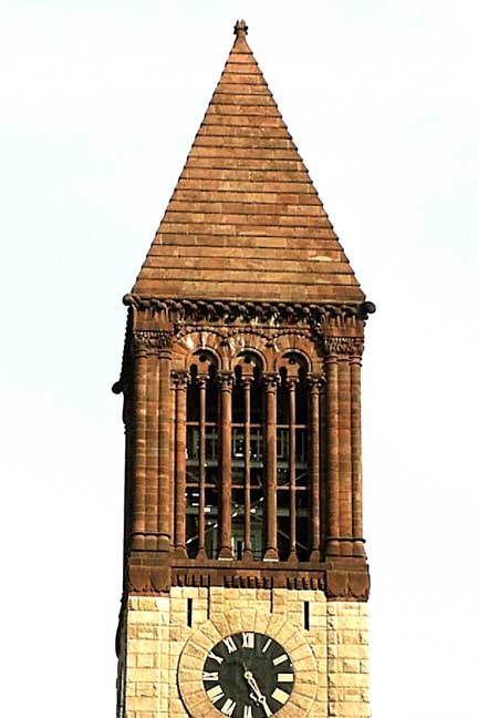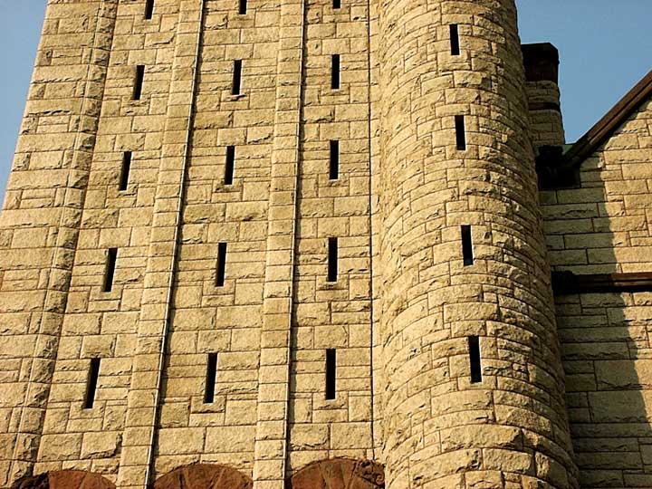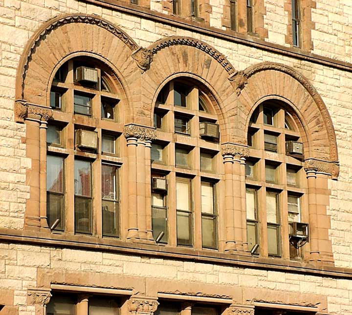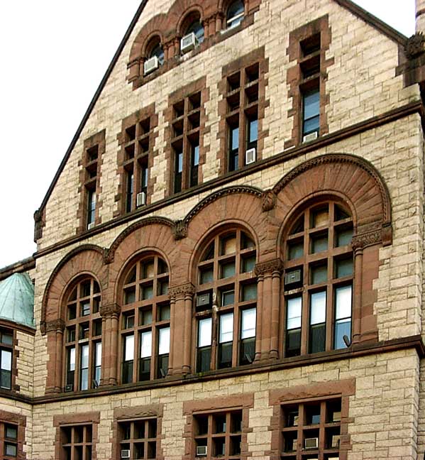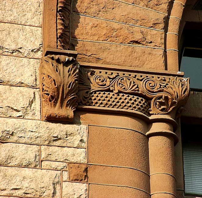 East elevation![]() East elevation: third story windows. Squat Romanesque Revival columns. ![]() East elevation ![]() East elevation: Second story. Note corbel at far left (detail in next photo below) ![]() East elevation: corbel decorated with acanthus leaf. |