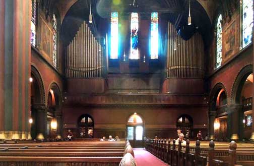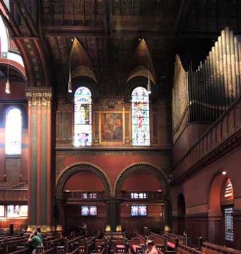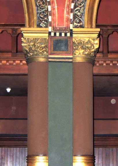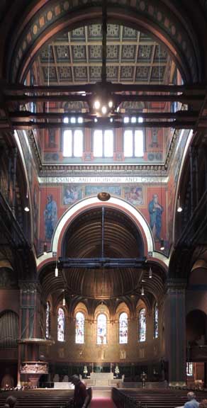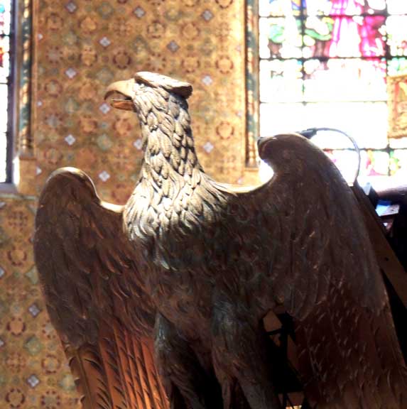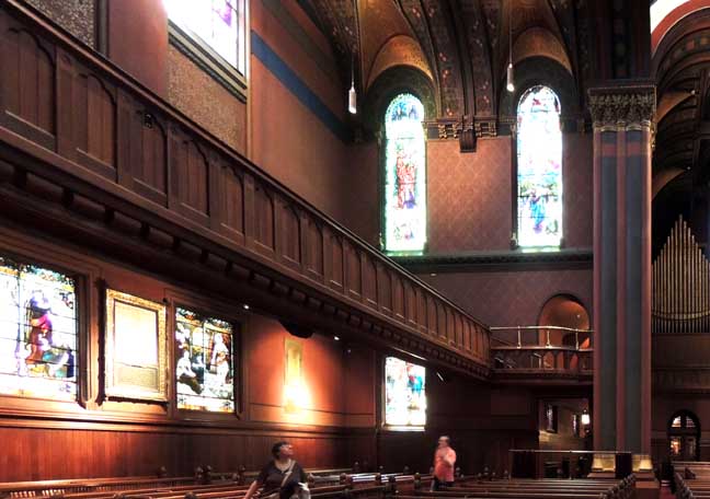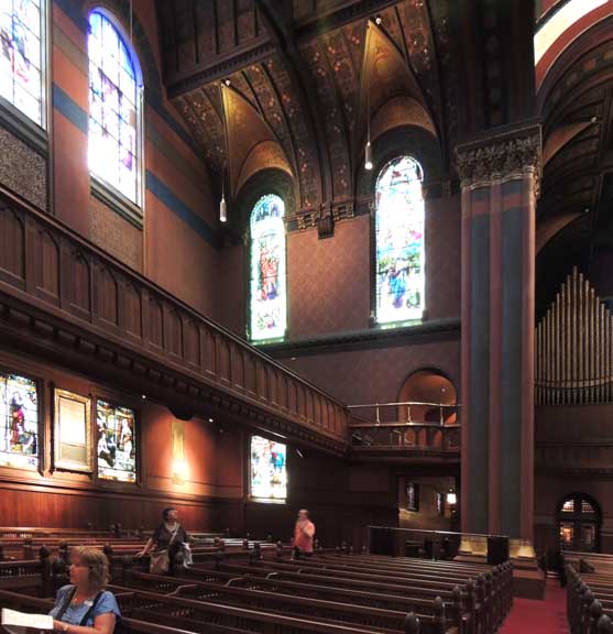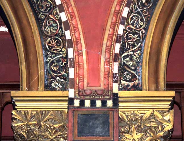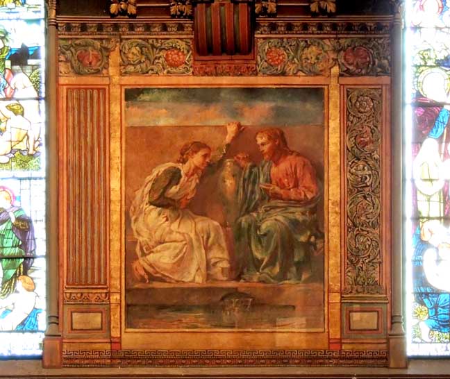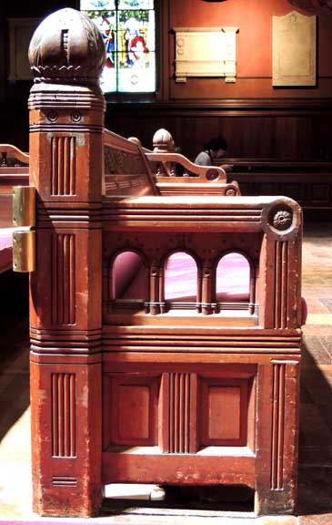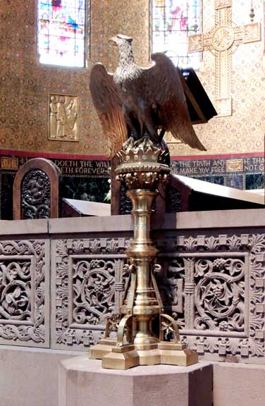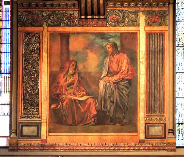 ![]() Central tower and apse with altar ![]() Note main sanctuary entrance ![]() Main sanctuary entrance ![]() Detail - Main sanctuary entrance ![]() Detail - Main sanctuary entrance ![]() Note entrance at lower right ![]() Note entrance at lower right ![]() Jesus Teaches Nicodemus mural between 2 stained glass windows ![]() Jesus Teaches Nicodemus (John 3: 1-23) mural by John LaFarge ![]() Christ with a Woman at the Well (John 4: 7-28) mural by John LaFarge ![]() Arch supported by engaged column which is detailed below: ![]() ![]() Note bead-and-reel and egg-and-dart moldings ![]() Eagle (symbol for John the Evangelist) lectern, a mainstay for Episcopal churches ![]() Detail - Eagle (symbol for John the Evangelist) lectern ![]() Eastlake features in side of pew |