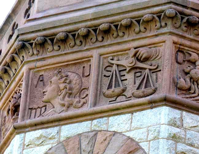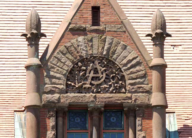 South Elevation![]() South and east elevations. A lower gable roof, also of red-orange terra cotta tiles, extends over the southern section of the hall. ![]() South elevation. Polychromy ![]() South elevation. Greek cross and finial at top ... Trefoil carved in lintel ![]() South elevation ![]() South elevation ![]() South elevation ![]() Native, pinkish-gray North Easton granite |