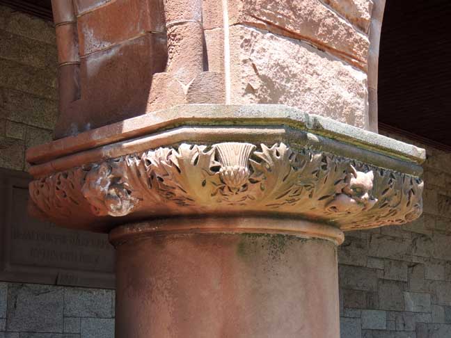 ![]() First floor. Capital: carved Scottish thistle, thistle leaves, and animal faces (next photo below;) ![]() First floor. Capital: animal face emerging from Scottish thistle leaves ![]() First floor. Capital: animal face emerging from Scottish thistle leaves |