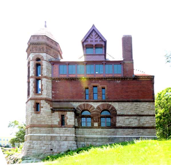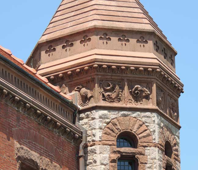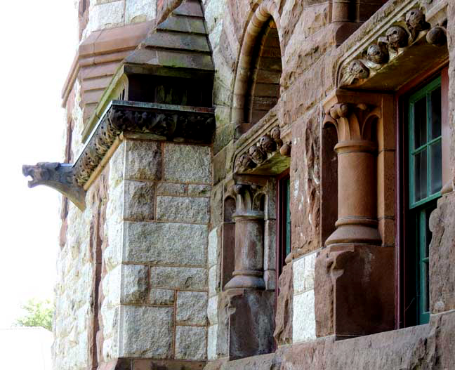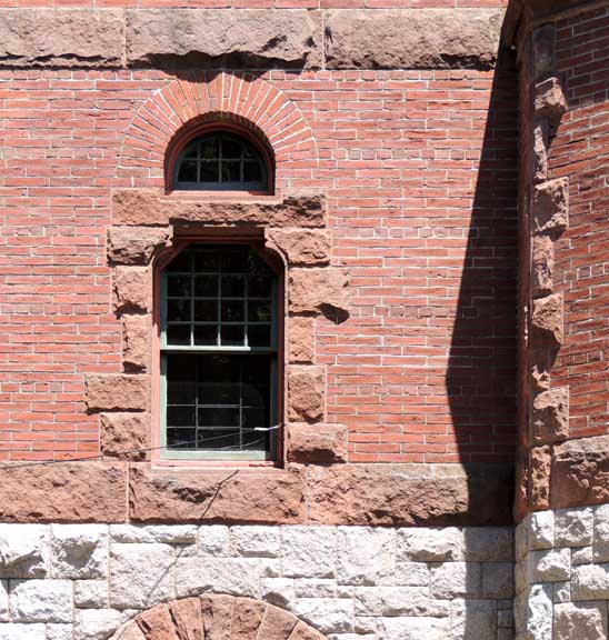 Right: Northeast octagonal tower constructed of warm light brown Monson granite ![]() Second story ![]() Second story: