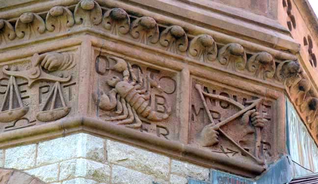 North elevation ![]() North elevation ![]() North elevation. Polychromy ![]() North elevation. Northeast octagonal tower. On the frieze are carved the twelve signs of the zodiac. The three signs in this photo: Virgo (The Maiden), Libra (The Scales), Scorpio (The Scorpion) ![]() North elevation. Northeast octagonal tower: On the frieze are carved the twelve signs of the zodiac. The three signs in this photo: Libra (The Scales), Scorpio (The Scorpion), Sagittarius (bow and arrow) ![]() North elevation ![]() North elevation Note lion scupper at left (detail in next illustration below:) ![]() North elevation Lion scupper ![]() North elevation. Polychromy ![]() North elevation |