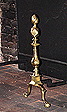 Chippendale brass andiron with diamond finial below spiral flame; claw-and-ball feet |