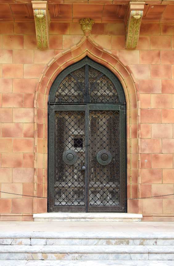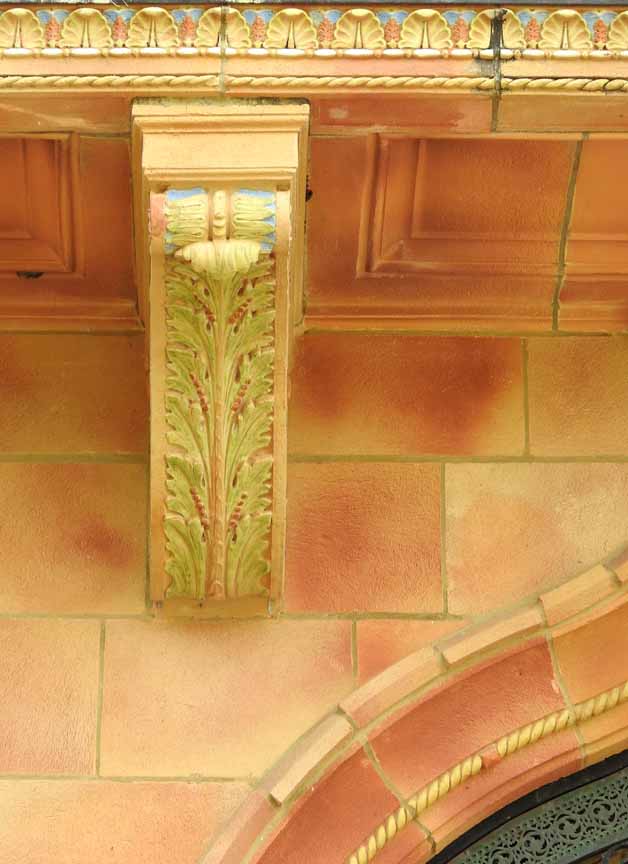 Bay #6 - Entrance ![]() Bay #6 - Entrance ![]() Bay #6 - Entrance Cornice: Glazed terra cotta Egg-and-dart Fourteen small modillions Three modillions with balusters and acanthus leaves ![]() Bay #6 - Entrance Cornice supported by modillions Bulls-eyes with rope surround Trefoil arches inside ogee/Venetian arches Stained glass originally made in Venice Engaged, smooth shaft columns Balconet supported by modillions Entrance surrounded by Venetian arch ![]() Bay #6 - Entrance Entrance surrounded by Venetian arch Wrought iron grill in front of door Marble steps ![]() Bay #6 - Entrance Top leaf-and-dart molding Bead-and-reel molding Rope molding Modillion with acanthus leaf decoration ![]() Bay #6 - Entrance Balustrade includes terra cotta-decorated rectangular supports and wrought iron panels ![]() Bay #6 - Entrance Marble steps detail ![]() Bay #6 - Entrance ![]() Bay #6 - Entrance Top leaf-and-dart molding Bead-and-reel molding Rope molding Bulls-eyes with rope surround Engaged finial Venetian arch window surround ![]() Bay #6 - Entrance Corbel decorated with acanthus leaves ![]() Bay #6 - Entrance Balustrade: Acanthus leaves decorating panel |