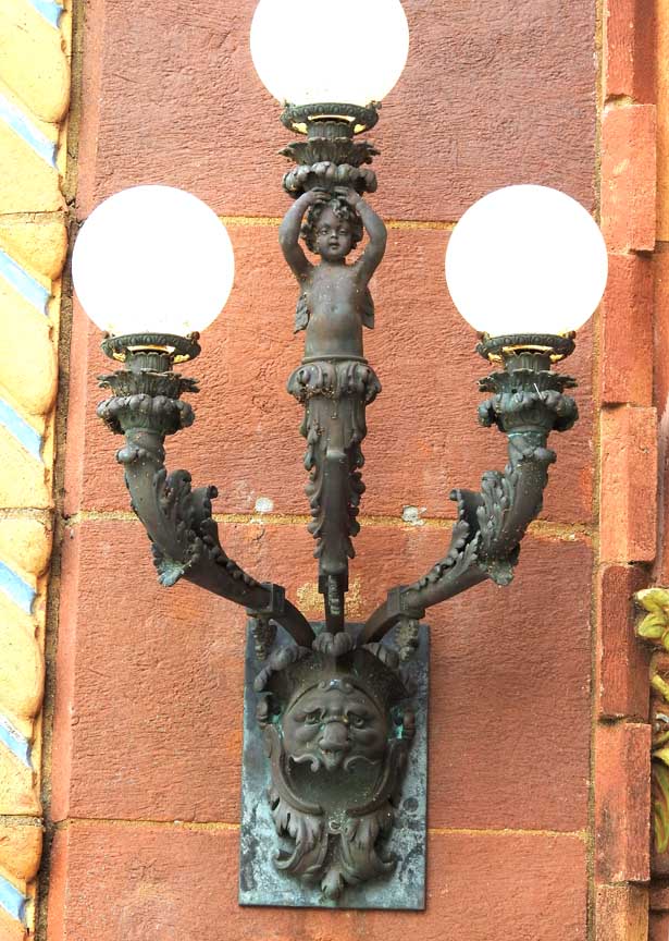 ![]() Bay #4 - Belvedere tower Terra cotta roof Modillions with acanthus leaves Paneled frieze Loggia with trefoil ogee arches Twisted column balusters Top balcony ![]() Bay #4 - Belvedere tower Top balcony Four stained glass windows (originally from Venice) with ogee and trefoil arches Five pilasters Wheel window motifs under stained glass panels Terra cotta panel features center cartouche enclosed in C scrolls and dual S scrolls flanked by festoons and male and female figures ![]() Bay #4 - Belvedere tower Quatrefoils with three trefoils below Balconet supported by modillions decorated with acanthus leaves ![]() Bay #4 - Belvedere tower Right side of tower on the first story Two bulls-eyes with rope surround Sconce detailed below: ![]() Bay #4 - Belvedere tower Sconce decorated with acanthus leaves |