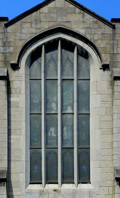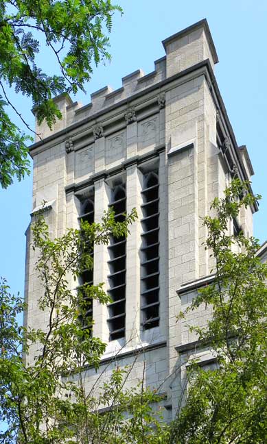 ![]() ![]() Crenelation ..... Belfry ![]() Pier buttressing , ![]() Label molding at ends of the Gothic arch |