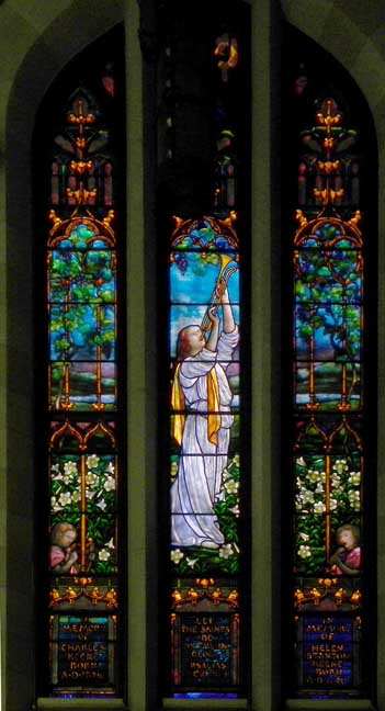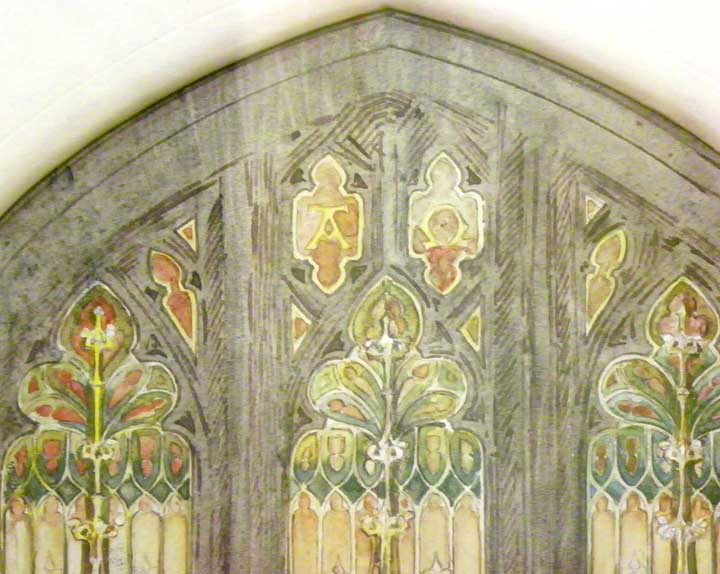 Musical Saints: Easter Window Based on Psalm 149 Installed 1906 ![]() Watercolor - Musical Saints: Easter Window The usual first step in designing and fabricating a stained glass window is to paint a watercolor. Once the design is agreed to and a contract is signed, the studio will proceed to draw a cartoon. Details of the watercolor below: ![]() Detail - Watercolor - Musical Saints: Easter Window Tracery ![]() Detail - Watercolor - Musical Saints: Easter Window Angel playing trumpet ![]() Detail - Watercolor - Musical Saints: Easter Window Reduced size angel playing musical instrument in lower corner is typical Tillinghast and is sometimes used to identify unsigned windows by her. ![]() Musical Saints: Easter Window Details below: ![]() Detail: Musical Saints: Easter Window ![]() Detail: Musical Saints: Easter Window ![]() Detail: Musical Saints: Easter Window ![]() Detail: Musical Saints: Easter Window Angel in lower right corner is typical Tillinghast and is sometimes used to identify unsigned windows by her. ![]() Detail: Musical Saints: Easter Window Most studios use enamel on stained glass window memorial wording, but Tillinghast usually uses individual pieces of glass, instead. |