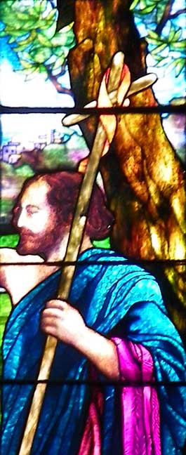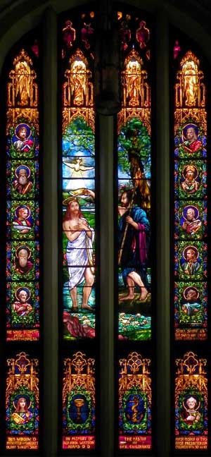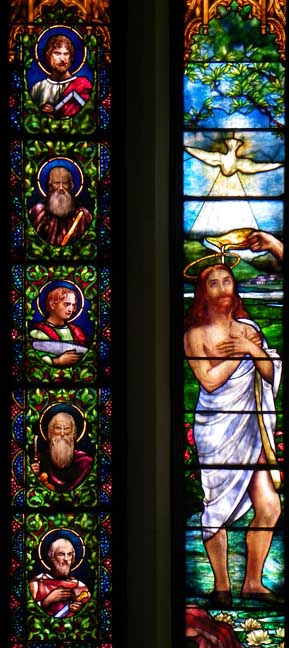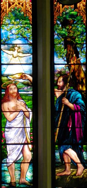 Baptism of Jesus Installed 1907. Subject matter and location (east transept) chosen because the baptismal font and reredos, also designed by Mary Tillinghast, are located in the same transept. ![]() Baptism of Jesus Details below: ![]() Detail: Baptism of Jesus Angels above the scene; saints flank the scene. Opalescent glass except for enameled faces and hands. ![]() Detail: Baptism of Jesus ![]() Detail: Baptism of Jesus Holy Spirit in the form of a dove. ![]() Detail: Baptism of Jesus Right panel: St. John the Baptist ![]() ![]() Detail: Baptism of Jesus Holy Spirit in the form of a dove. ![]() Detail: Baptism of Jesus Panel #4: saint. Border glass includes jewels. ![]() Detail: Baptism of Jesus ![]() Detail: Baptism of Jesus |
