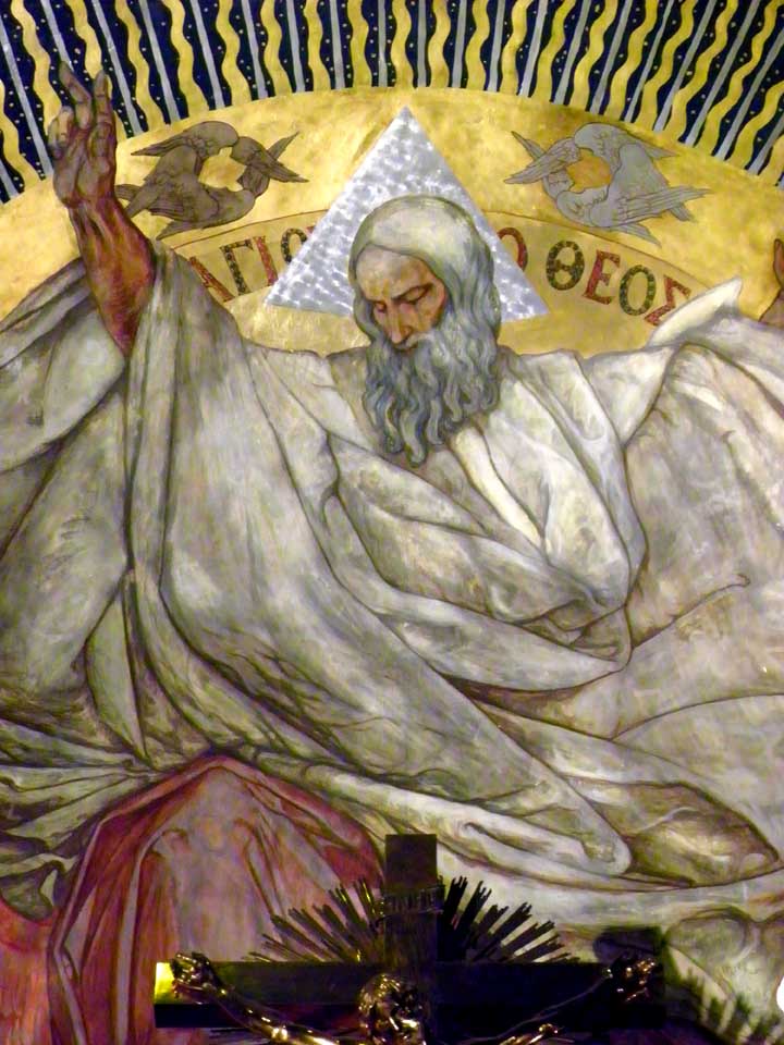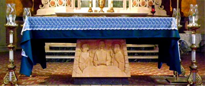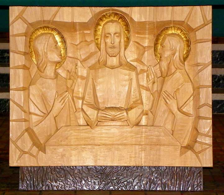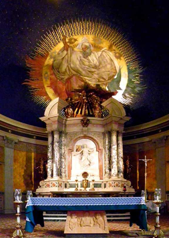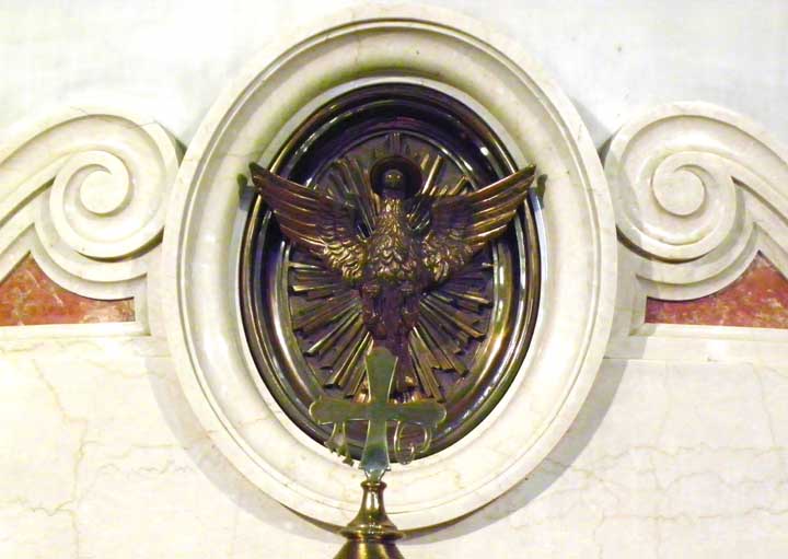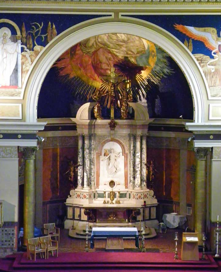 ![]() The wings at the top of the photo represent angels. Note the triangle behind the figure's head: this symbolizes the Trinity. ![]() God the Son, Jesus, is depicted crucified. PX on the cartouche is a symbol for Jesus. Below the cartouche is a marble keystone. ![]() ![]() Mosaic: Mary and Jesus ![]() Angel standing on marble scroll buttress. ![]() ![]() Tabernacle and candlesticks ![]() The dove represents the Holy Spirit, a member of the Trinity. Note marble scroll buttresses. ![]() Scroll buttress ![]() ![]() After Vatican II, Catholic priests faced the congregation while celebrating Mass; as a result, many churches added a second altar like this one. ![]() |