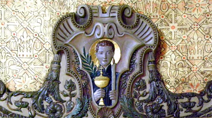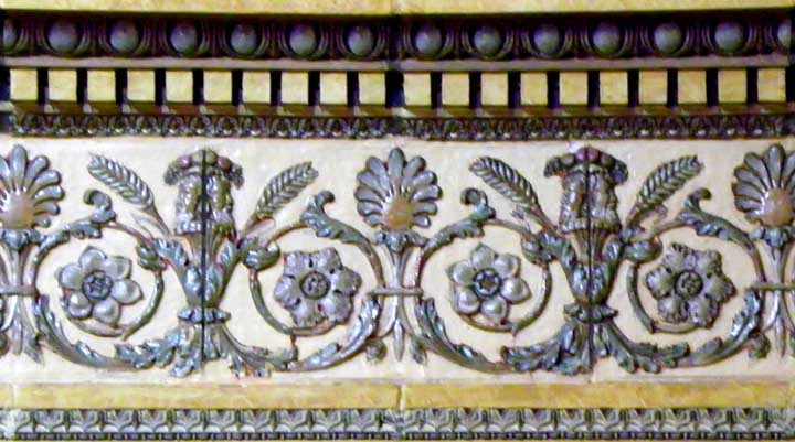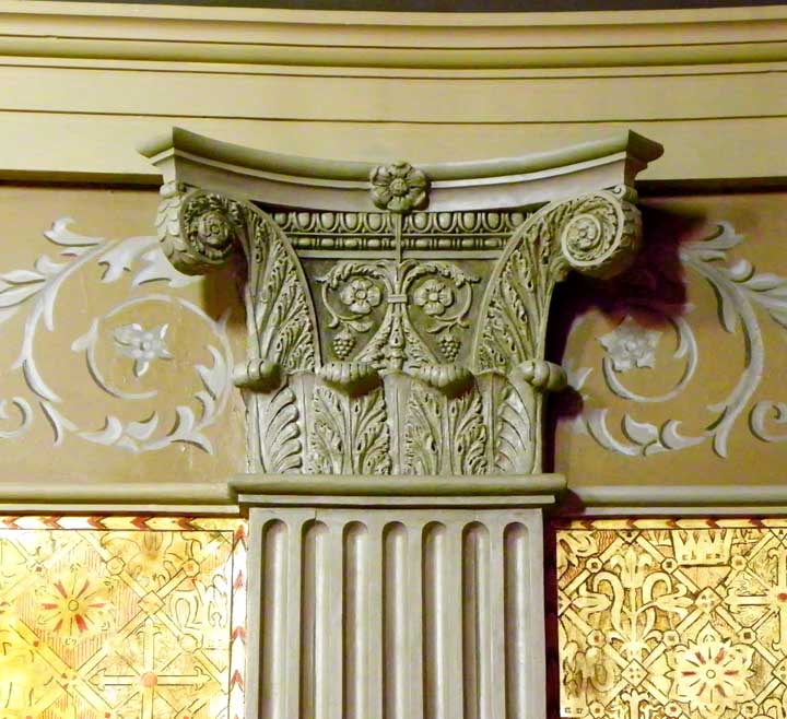2010 Photos Paneled door and surround ![]() Details below: ![]() Top: Dentil molding 3 rosettes below the dentils. Scrolling acanthus leaves behind the Corinthian capitals atop fluted pilasters. ![]() Scrolling acanthus leaves behind the Corinthian capitals atop fluted pilasters. Capital details, from the top: Fleuron ..... Egg-and-dart molding ..... Bead-and-reel molding .... Scrolling acanthus leaves with hanging grapes ..... Volutes decorated with acanthus leaves ..... Bottom row of acanthus leaves. ![]() Medallion flanked by acanthus leaves depicts priest with chalice and candle and palm leaf. Stenciled wall. ![]() Egg-and-dart molding (top). Dentil molding Scrolling acanthus leaves. Leaf-and-dart molding. Bead-and-reel molding |