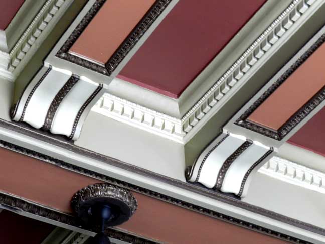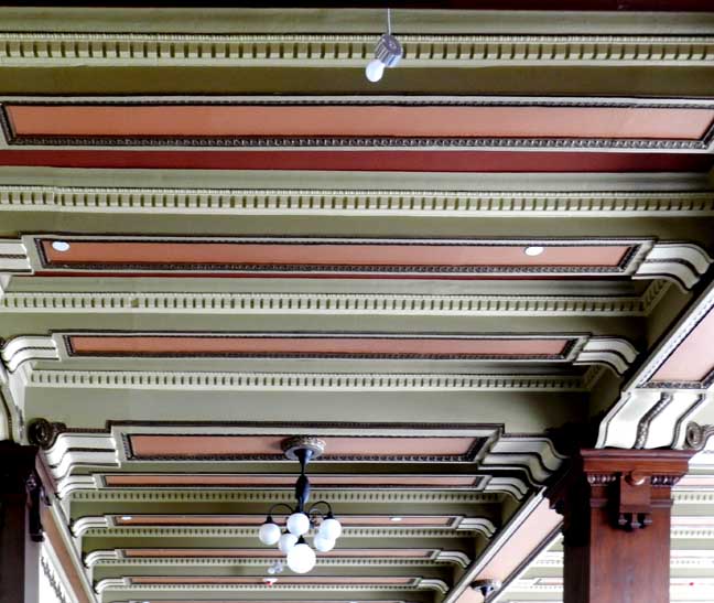a drop ceiling, the room features pilasters supporting a beamed ceiling