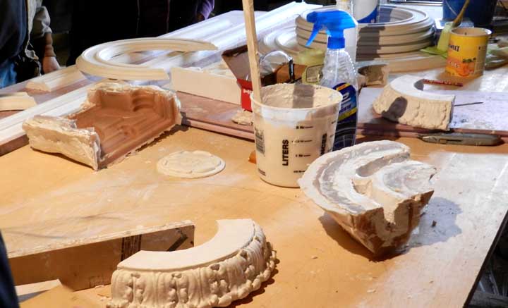 "The largest public space in the building, the ballroom is situated in an addition constructed southeast of the hotel in 1916-1917. Unlike the other large spaces on the main floor, it is unobstructed by columns, as there are no guest room floors above. The ceiling features large beams supported by fluted Corinthian pilasters along the side walls. The upper sections of the walls between the pilasters swag decoration in plaster relief. At the western end of the space is a small stage in the form of a semicircular exedra, which was added within the westernmost bay of the original space during the alterations to the hotel during 1924-1926. Three large windows on the south and one on the east originally lighted the space, but these have been filled in, and now contain small sash windows. " - WCPerspective, History of The Lafayette: The Interior ![]() ![]() ![]() ![]() Rocco Termini, Signature Development in the Grand Marquis Ballroom ![]() Rocco Termini, Signature Development in the Grand Marquis Ballroom ![]() Rubber mold created by artisans to reproduce damaged molding in Grand Marquis Ballroom ![]() Plaster replacements ![]() |