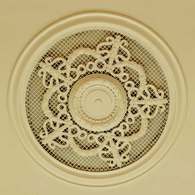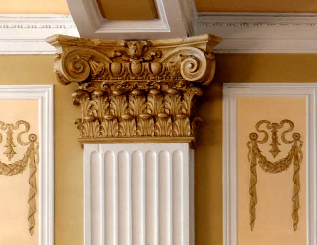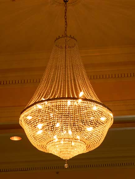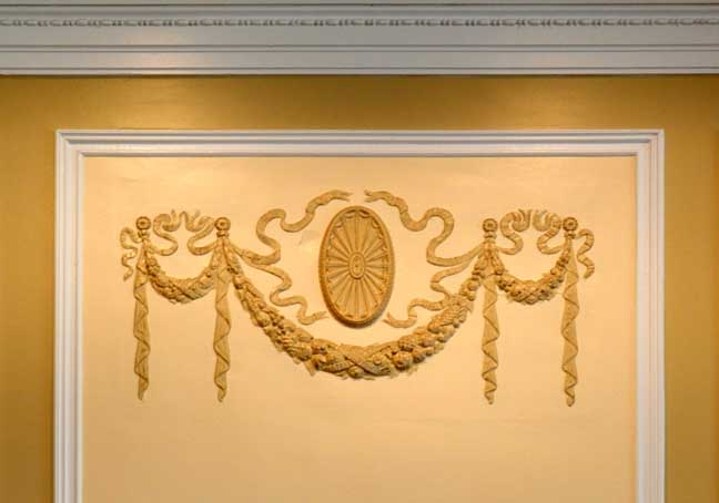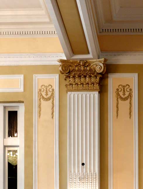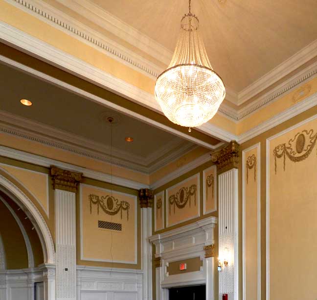 "Damage to the ceiling was extensive. The plaster beams were removed, the damaged ones replaced, and a new system was put in place to support the new beams and ceiling. Unlike the floors in other areas of the hotel, the floor in the ballroom is wooden. One speculation is that when this addition was built, the owners could not afford a tile floor and used the cheaper covering of hardwood." - Jackie Abarella's Blog (online March 2018) ![]() ![]() ![]() 2012 replica crystal chandeliers ![]() Patera ... Festoons ... Ribbons ![]() Dentil molding ... Corinthian pilaster features fluting and bell flowers (chandelles) ... Festoons ... Ribbons ![]() ![]() Ceiling medallion |