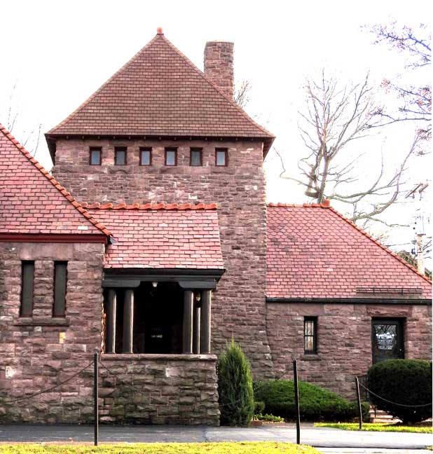 Tower:  Terra cotta finial and shingles on pyramidal roof                    Decorative loophole