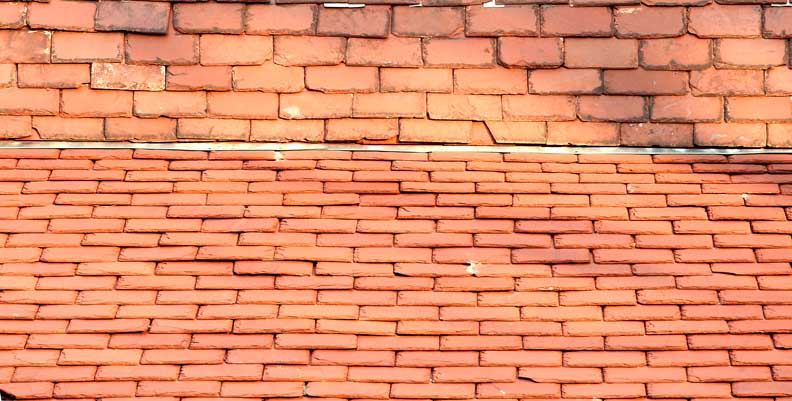Roof at left: terra cotta ridge tiles on terra cotta shingled roof.