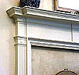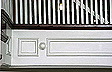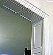 The stair railings are set on very tightly spaced square spindles, which terminate without newel posts in spiral designs reminiscent of the Ionic column capitals of the portico. |