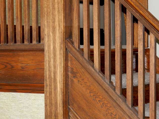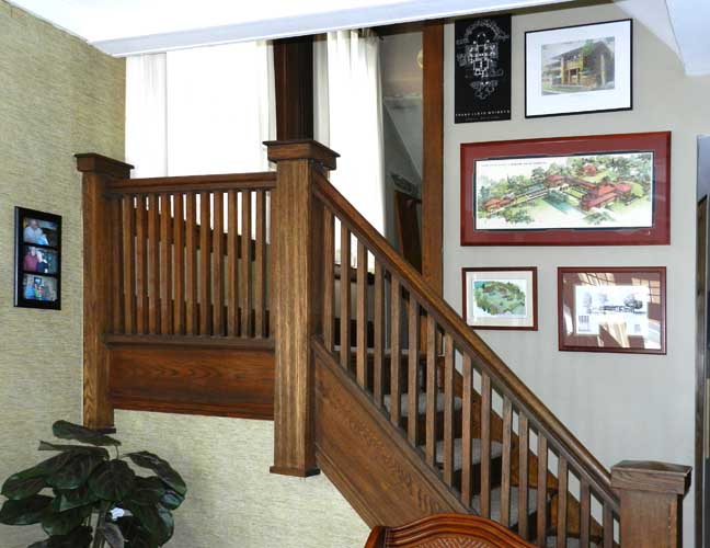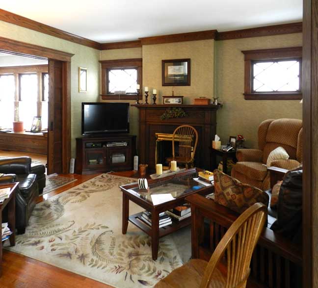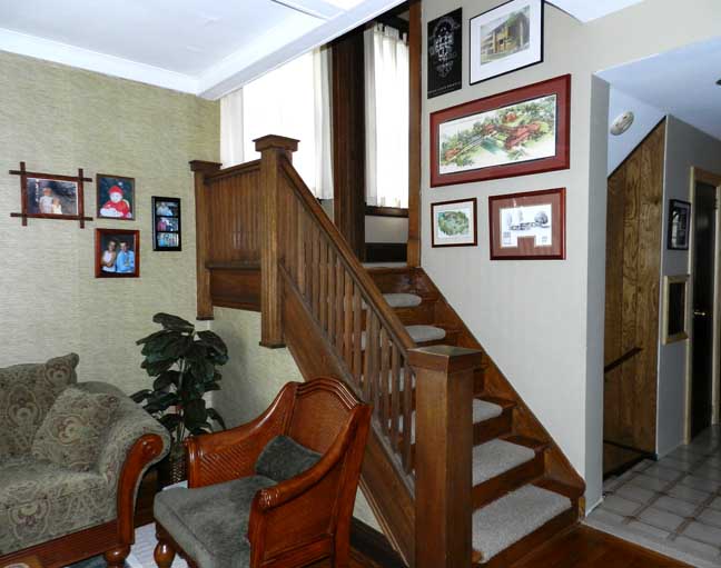 Typical first floor Foursquare layout: Entry hall and living room at front; dining room and kitchen at rear Entry hall ![]() Entry hall. Front door at left ![]() Entry hall. Kitchen at right. ![]() Entry hall. ![]() Entry hall. Typical Arts & Crafts style rectangular balusters and newel post |
