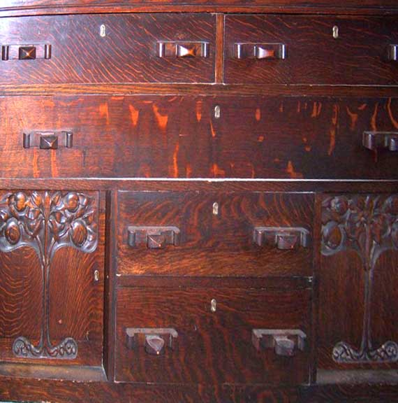 David Wolcott Kendall (b. 1851, d. 1910) was born in Rochester, New York, the son of a cabinetmaker who taught him the trade. He came to Grand Rapids, Michigan in 1879 to work for Phoenix Furniture Company, and began a career that had significant and lasting effects on the furniture industry. A man of varied interests and talents, he set up a chemistry laboratory in the basement at Phoenix and developed special finishes that transformed wood such as oak and ash into products more attractive to customers of the period. David Kendall traveled throughout Europe, Asia, and Central America to study new forms and decorative motifs in furniture design. The many rare and beautiful objects he acquired in his travels are still in the collection of Kendall [School of Art]. His lasting designs earned him the moniker “Dean of American Furniture Designers” and included a version of the Morris Chair that became known as the “McKinley Chair” after President McKinley selected one for installation in the White House. Kendall was also credited with developing an office chair that revolves and reclines. - Kendall College of Art and Design (online Feb. 2014)