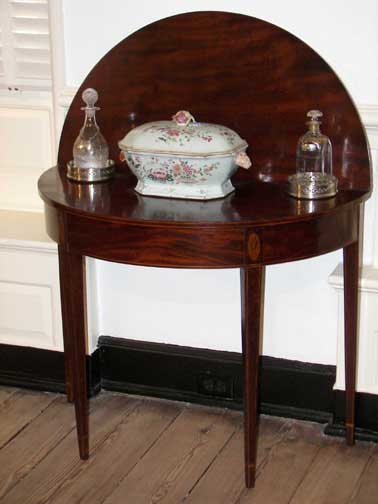 Round card tables inspired by Hepplewhite designs are rare because Americans favored more complex shapes during the Federal era. Nonetheless, some circular card tables were made in Boston, New York, Philadelphia, and Rhode Island. Rhode Island examples are most elegant because of their fine inlay, often more elaborate than that on the table shown here.