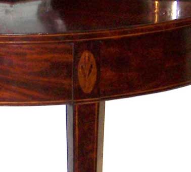 Round Hepplewhite card tables from America may be easily confused with those from England. Secondary woods: pine was most commonly used in this country, while oak and ashwere more prevalent in England. American inlay is usually crisper in outline than English inlay.