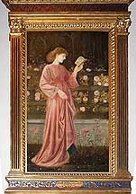 [Dante Gabriel] Rossetti was a poet as well as a painter, and in common with the other Pre-Raphaelites, his art was a fusion of artistic invention and authentic renderings of literary sources. The brotherhood drew heavily from Shakespeare, Dante, and contemporary poets such as Robert Browning and Alfred Lord Tennyson - Rossetti in particular was greatly attracted to Tennyson's reworkings of the Arthurian legends. He specialized in soulful maidens of extraordinary looks for his romantic themes, using his beautiful but neurotic wife Elizabeth Siddal as his model. Her striking face, with its long-nosed, languid expression, appears in many pictures. After Elizabeth's death, Rossetti's model was William Morris's wife Janey (a Siddal look-alike). |