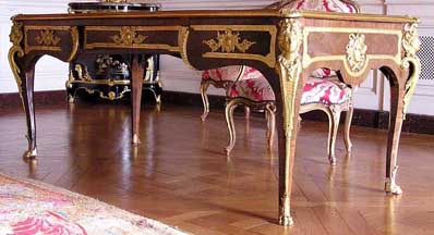 The legs of furniture took bulging outlines and the corners of panels were curved. The use of gilt bronze (ormolu) was extended, and walnut, rosewood, and other woods largely replaced ebony in veneers.