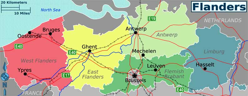 Flanders: (Dutch: Vlaanderen) is the Dutch-speaking, northern part of Belgium wedged between the North Sea and the Netherlands in the north and Wallonia and France in the south.