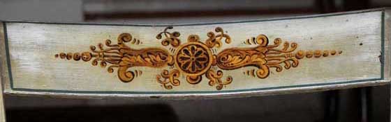 History - furniture The stencil is an age-old tool, and stenciling - the art of applying design to a surface through superimposed openings - is an ancient craft. It originated in various areas at different times and for different purposes. A natural source as simple as the holes in leaves may have provided the first stencils. The Etruscans, of whose earlier civilization so little is known, ornamented their vases through copper stencils. The early Fiji Islanders decorated cloth with stenciled geometric borders; in ancient monasteries we find hand-colored "stamped" Buddhas; in the Caves of a Thousand Buddhas on the Central Asian Silk Road "rows of stenciled Buddhas, dark brown with white draperies on a pale green ground" were uncovered. Japanese craftsmen stenciled designs on fabric and paper, and stenciled their elaborate No robes in gold. Writing was taught with stenciled lettering; the Barbarian kings and Roman emperors signed their names through stencils, and the ecclesiastical insignia IHS was stenciled on altars and vestments. Fifteenth-century playing cards were decorated with stencil designs, and in the late seventeenth century the Frenchman Jean Papillon delighted the world with the first stenciled wallpaper. In England early stenciling served mainly religious purposes. We find it on rood screens, in mural design, and on the garments of saints. In the seventeenth century such ornamenting was flocked onto paper by applying ground wool adhesively to the surface, and may be accepted as the precursor of our own American theorem, or stenciling on velvet. In the early nineteenth century, when inventive American furniture makers were seeking alternatives for all the carving, inlay, and mountings that made European imports so desirable and expensive, they soon discovered that simulating them by the simple procedure of painting - that is to say, by brushing gold powders mixed with turpentine or varnish mediums - did not provide the lustrous effects desired. However, the rubbing in of multicolored bronze powders through stencil openings onto a tacky varnish surface created a burnished tone, and a clever ability to shade and strike sharp divisions off contoured stencil edges, called templets, resulted in a form of ornamentation that became widely acclaimed and was relatively inexpensive and fast - at least by the labor standards of that day. Certainly, for any effort to decorate in quantity as well as quality, stenciling offered a practical method for producing elegant designs where painting did not. The earliest documented American stenciled ornamentation on furniture dates from approximately the time of Lambert Hitchcock's arrival at the Fork-of-the-Rivers in Barkhamsted, Connecticut, in 1818, and he became the outstanding pioneer in its development. History - Hitchcock furniture Painting, graining, stenciling, striping, banding - all these characteristics contributed to the name "Hitchcock" soon becoming a widespread term and ultimately a generic word applied to many early American decorated home furnishings. Lambert Hitchcock's artists were to become known among the best in the New World. Most stenciled chairs, including examples he manufactured as well as Hitchcock-type chairs made elsewhere, were usually painted black; other colors were custom finished to order, probably as the chair moved from the formal elegance of the parlor and dining room to the lighter intimacy of the bedroom. Also bright hues, especially on the plank-seated styles, cheered up many a dreary kitchen. However, some were finished in the natural wood, as noted in an advertisement in 1829, in which B. Hudson had just received "a quantity of Curl Maple Chairs" from Hitchcock's Factory - no paint or decorations whatever.
