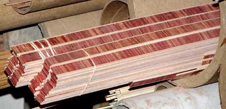 A yellowish wood with red and purple stripes from a small Brazilian tree, a member of the rosewood family.