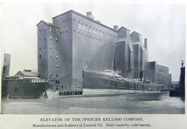 Spencer Kellogg Spencer Kellogg's grandfather [Supplina Kellogg] began milling linseed oil in 1824 in the Mohawk Valley near Amsterdam, New York. Spencer Kellogg moved to Buffalo and, at age 28, built his first linseed oil mill in 1879. By 1894, he constructed a second mill, giving him a total of 36 presses, making his the largest linseed oil plant in the U.S. The Spencer Kellogg & Sons, Inc. company, was incorporated in 1912 with its headquarters in Buffalo. In 1940, the company operated four flaxseed crushing plants, four soybean crushing plants, one copra crushing plant in Manila, one castorbean crushing plant and one tung oil rectifying and refining plant in Hankow, China. |