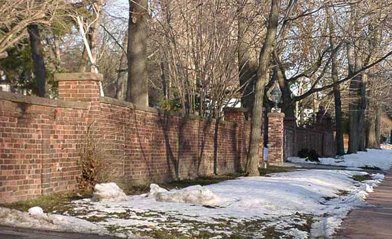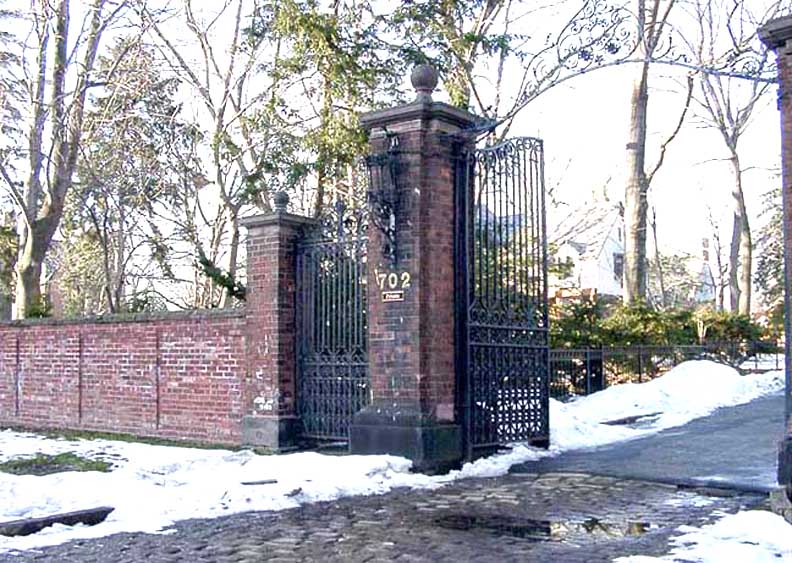 Writer Edwine Noye Mitchell, who published in local newspapers, described the property. A red brick wall surrounded the estate. It was interrupted in places for a "picturesque group of stables, pierced by a carriage drive." Mitchell wrote that the house, a great gray stone dwelling, was surrounded "by terraces where the crocus and scilla pushed up between the flagstones in the spring, and the pink magnolia blossoms lay thick over the grass from the sidewalk. An intricate wrought iron gate, known today as Queen Anne's Gate and which still stands, stood sentinel outside of the propertyAdditional information: