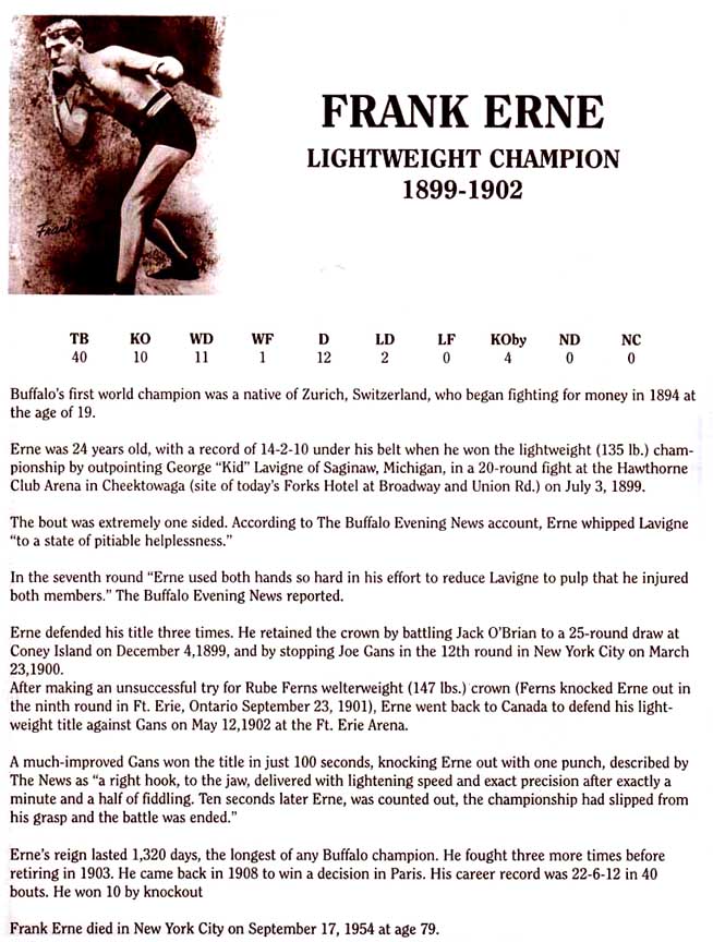 Boxing in Buffalo, NY - Table of Contents ............... Boxing Insider Buffalo Veterans Boxers Association 34th Annual Dinner Banquet Program, May 10, 1997 Frank Erne 1918-1984